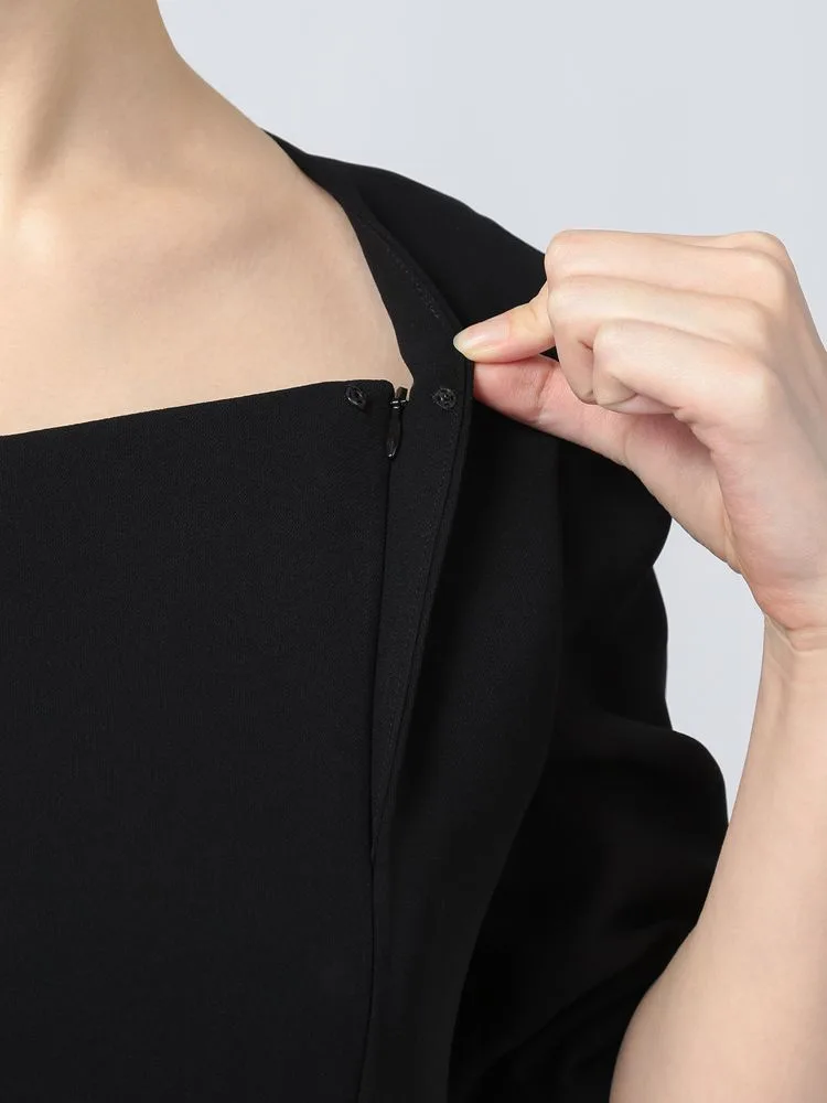 スクエアネックデザインのワンピースで長年愛用できるシンプルなアンサンブルに仕上げました。