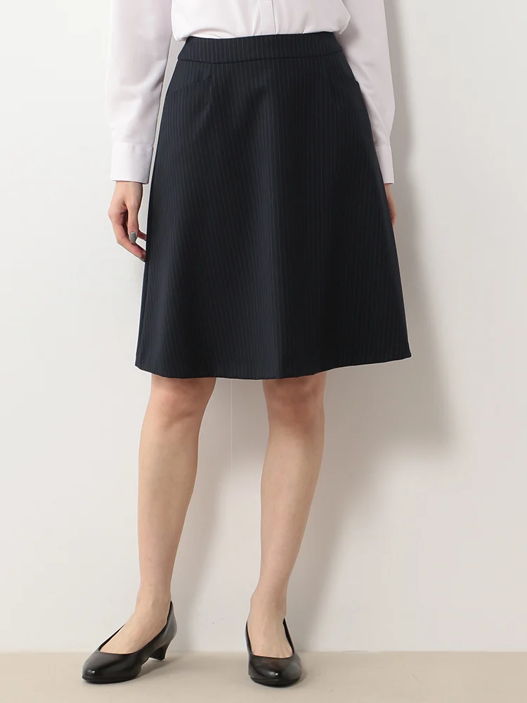【ウォッシャブル】ポケット付フレアスカート ストレッチ ネイビー ストライプ 通年【レディース】
