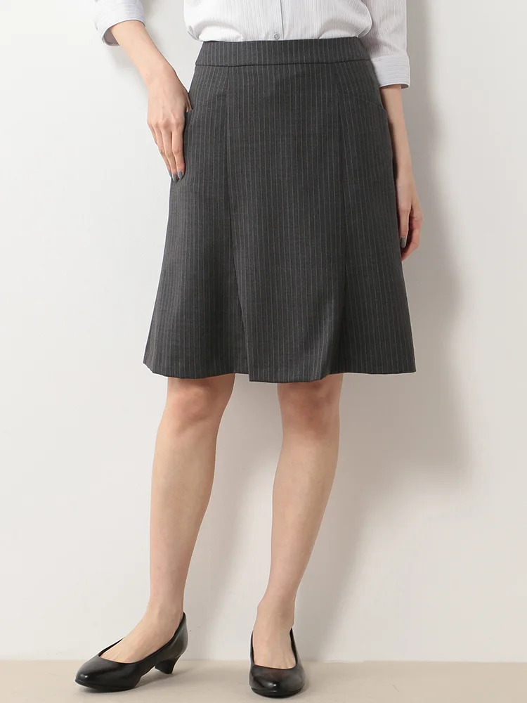 【ウォッシャブル】ポケット付 Aラインスカート ストレッチ グレー ストライプ 通年【レディース】