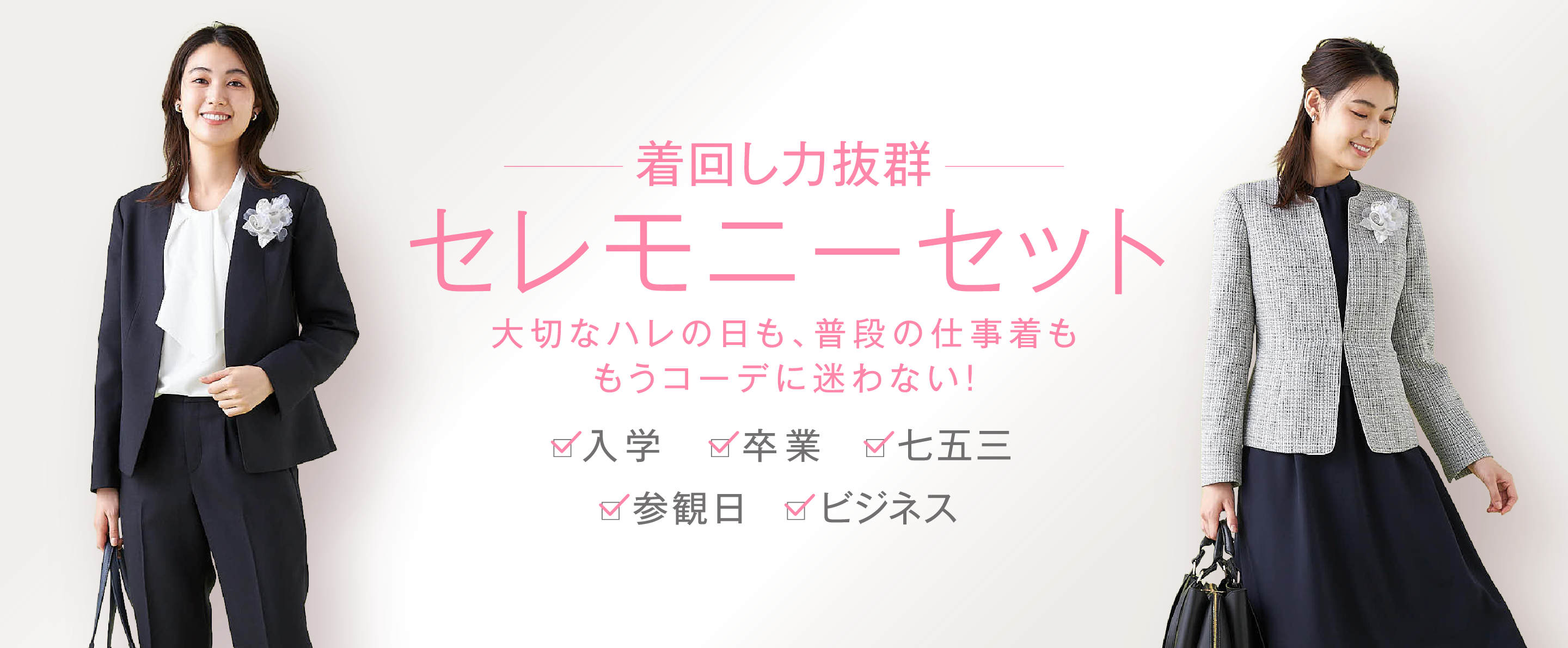 入園/入学・卒園/卒業の2シーンで使える、華やかながらも落ち着いた雰囲気を持ったセットスーツです。