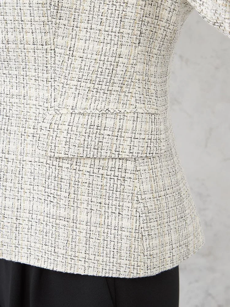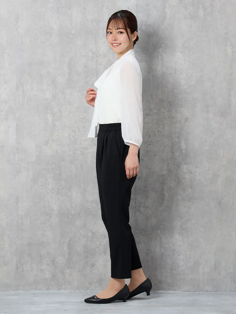 ツイードジャケットとボウタイブラウス、無地のテーパードパンツをセットにしました。
