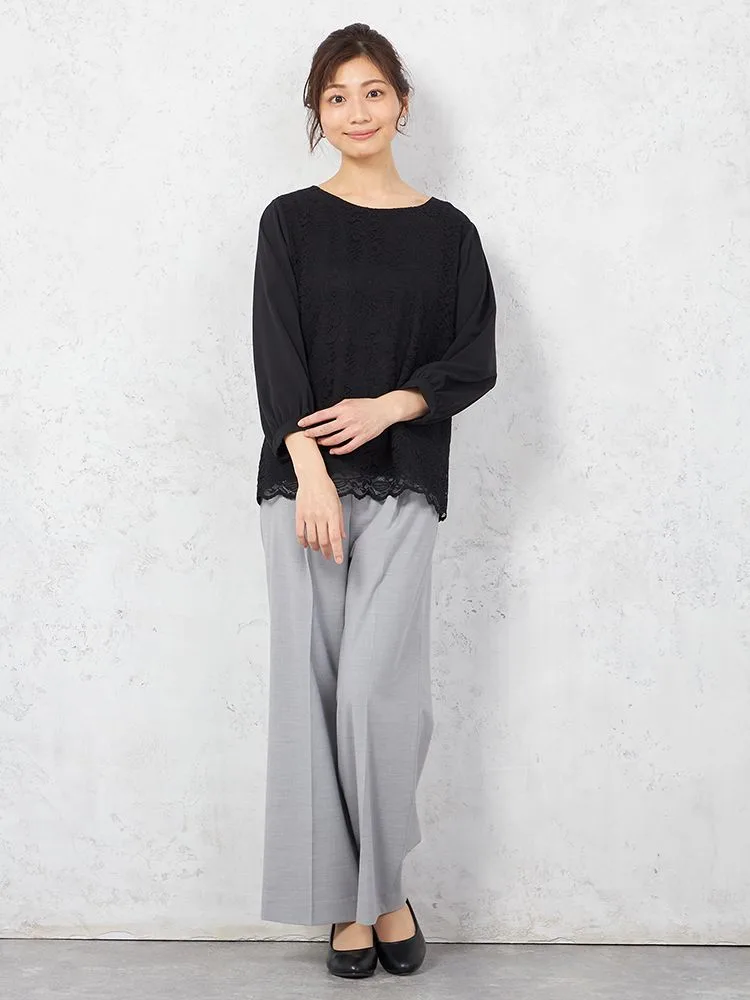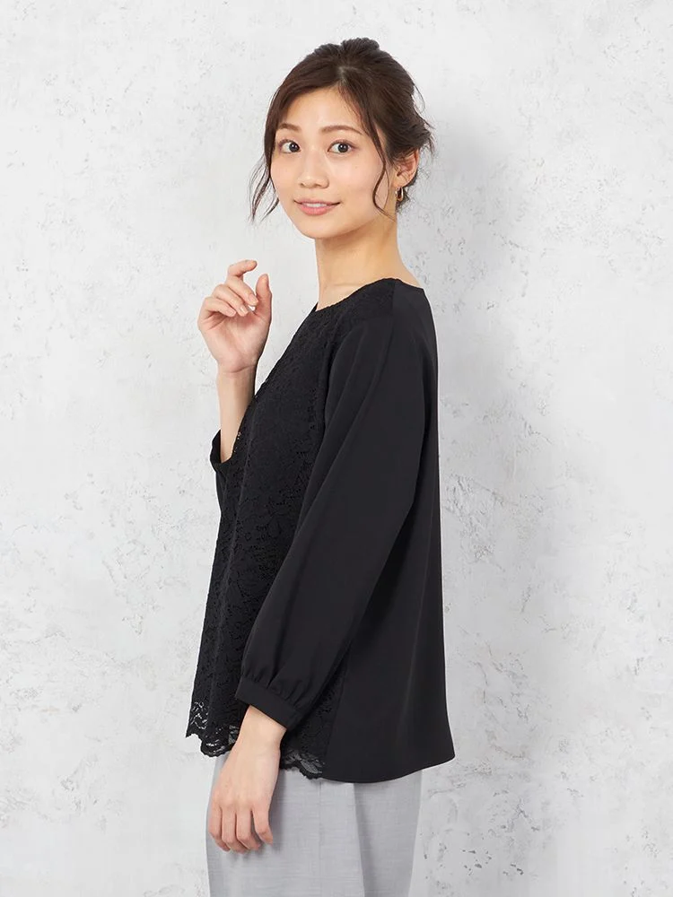【ウォッシャブル】ブラウス 7分袖 レース重ね UV加工 中柄 SOFFICE 通年【レディース】(ブラック)