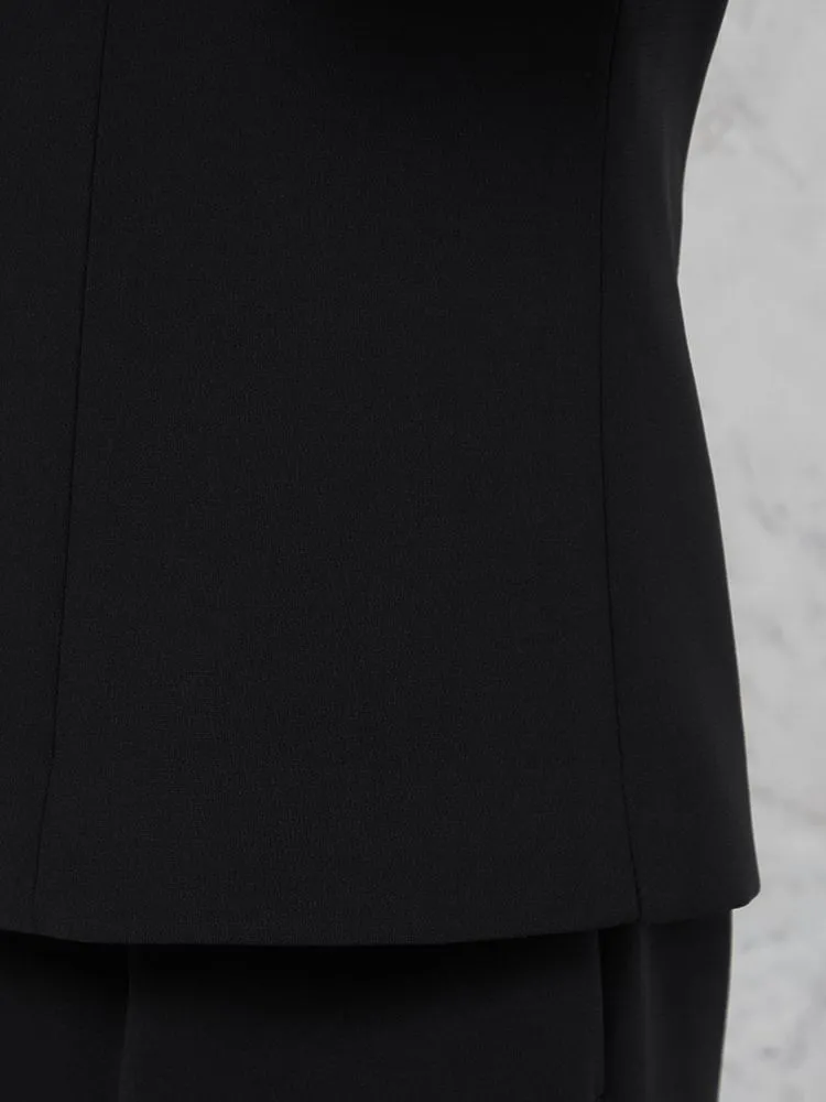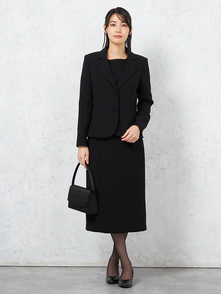 袖丈長めの上品見えワンピースに、テーラードジャケットを組み合わせた、ベーシックなフォーマルアンサンブルです。