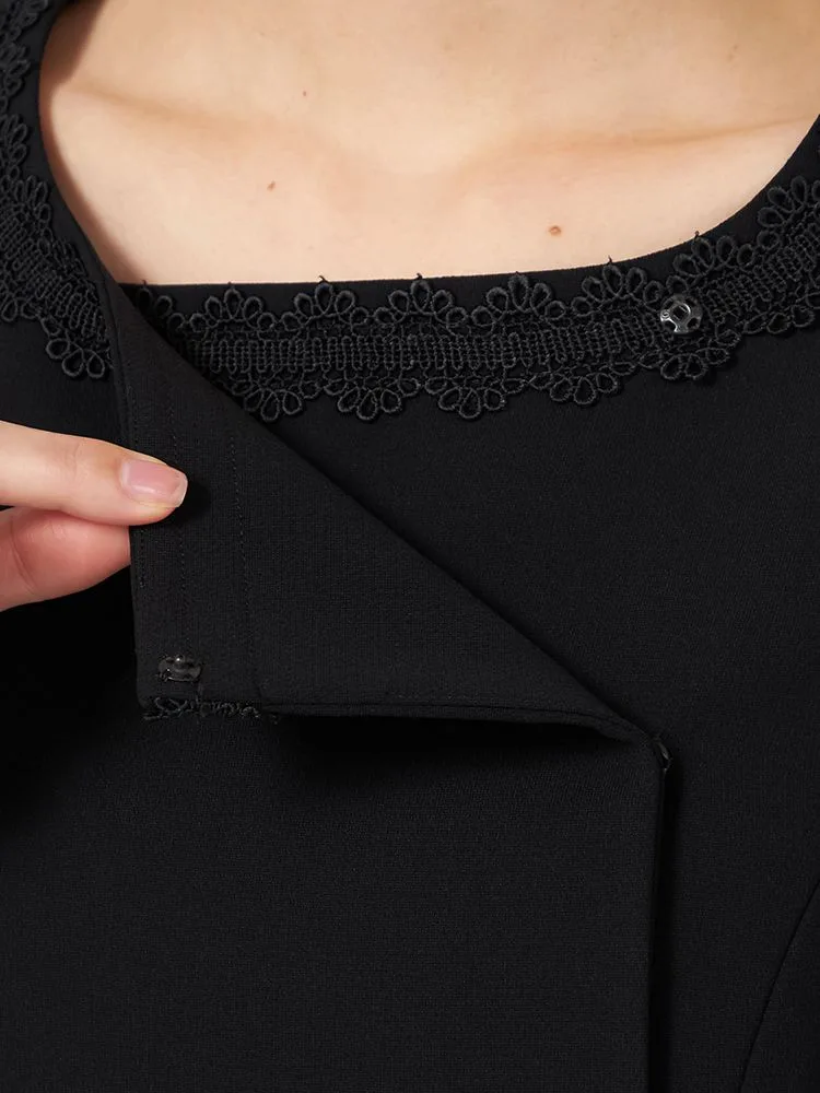 ワンピースは単品でもアンサンブル風に見えるため、きちんと感があり、衿ぐりレースでエレガントな印象を与えてくれます。