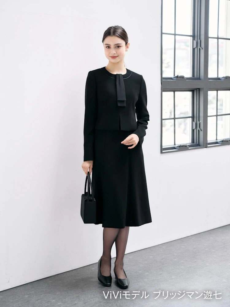 【上下ウォッシャブル】フォーマル アンサンブル ボウタイ取り外し可 ノーカラージャケット/ワンピース 黒無地 ViVi 通年 礼服【レディース】