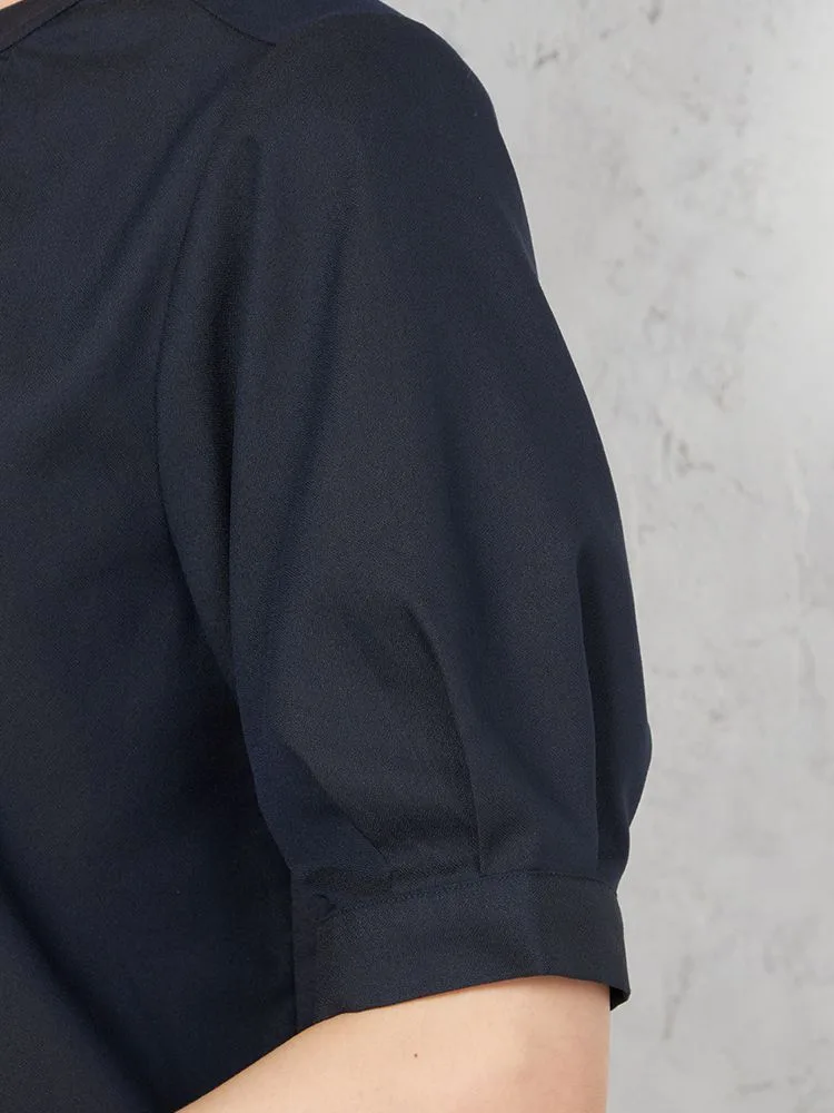 ふっくらとした袖の可愛らしいフォルムとカーブを描くようにカットしたヘムラインも特徴のひとつ。