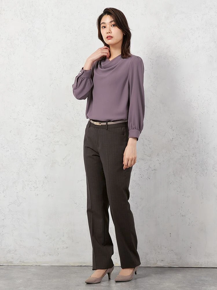 顔まわりやデコルテをやわらかく包むようなドレープネックがエレガントなブラウス。