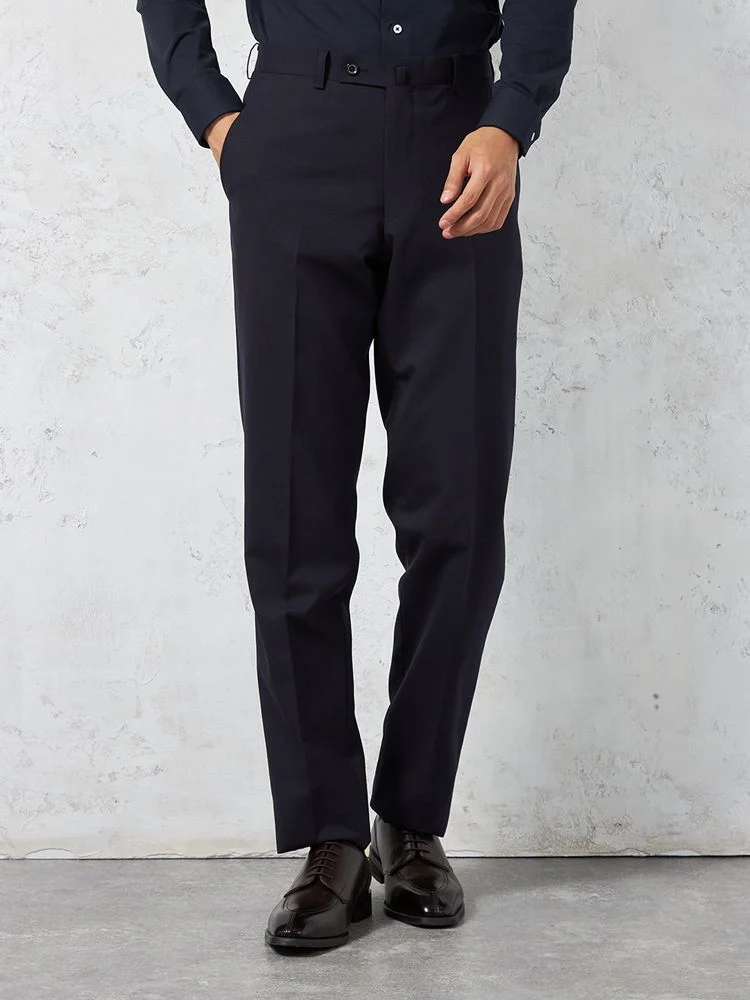 パンツの腰回りに生地の折り込みがなく、スッキリとしたシルエットを実現します。シンプルで洗練された印象を与え、すっきりとした着こなしが可能です。