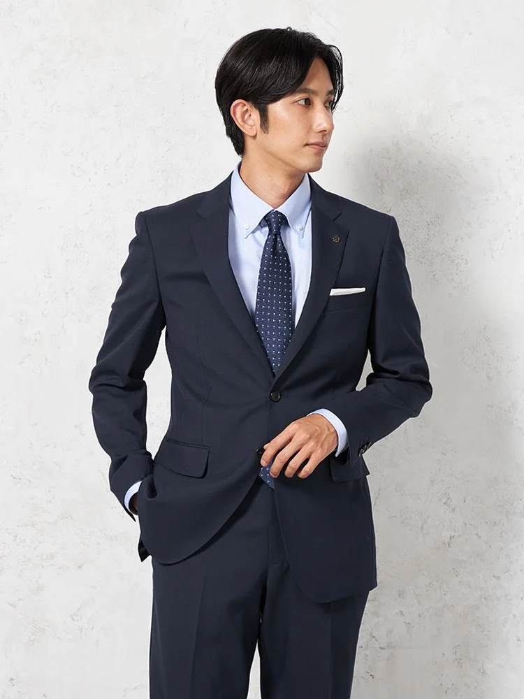サスティナブルウール素材を使用し、環境にも配慮したツーピーススーツ。