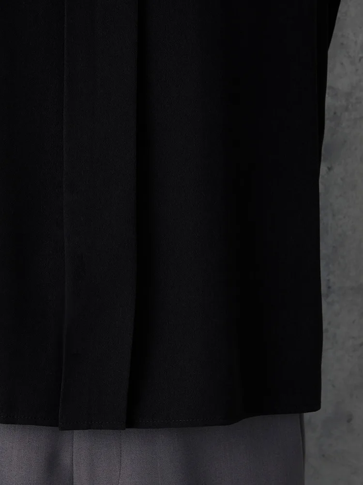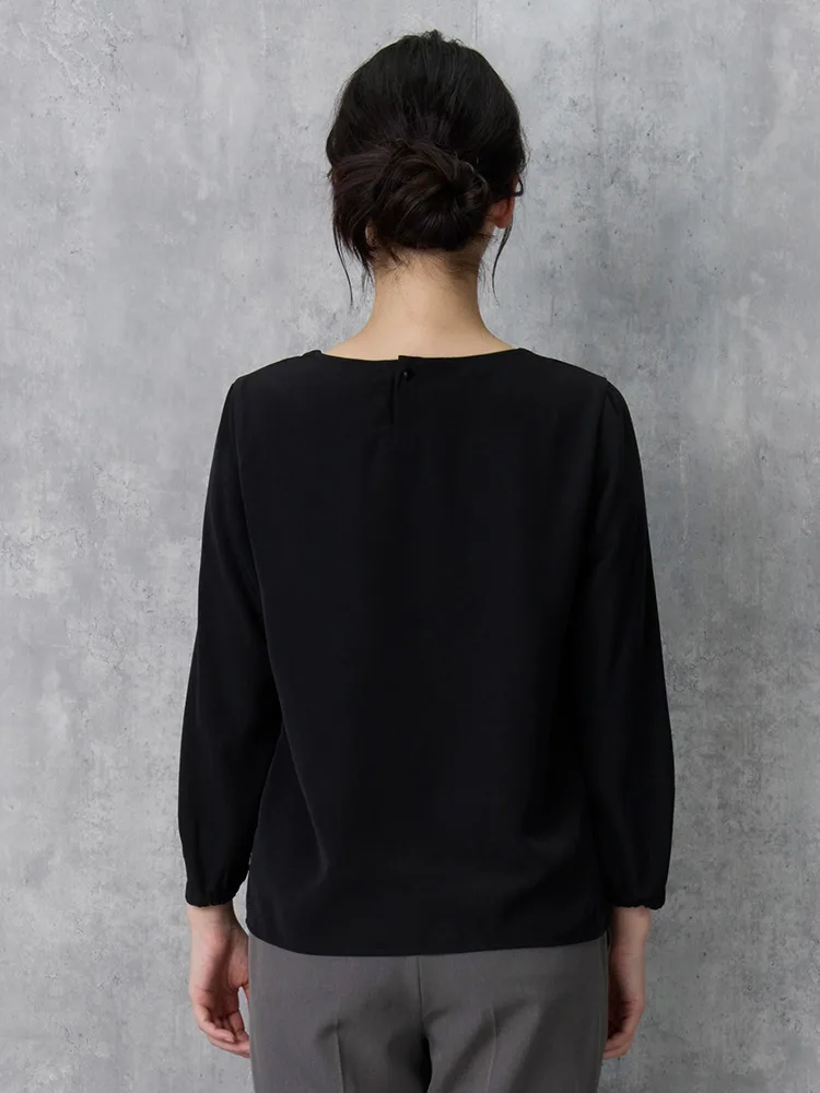 フロントのタックディテールで美しいドレープを演出した2枚仕立ての8分袖ブラウス。