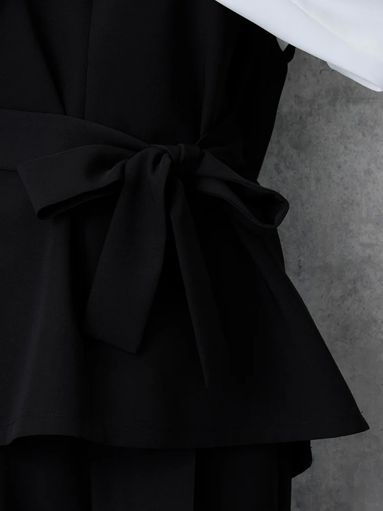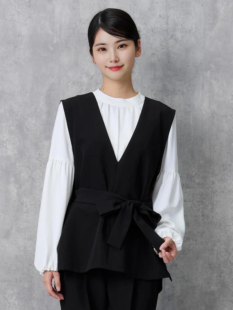 ジレは身体のラインを拾いすぎないスペックで、ウエストリボンデザインで体型カバーにも◎