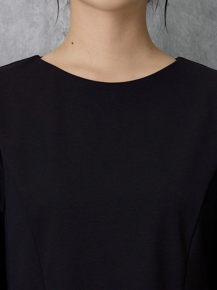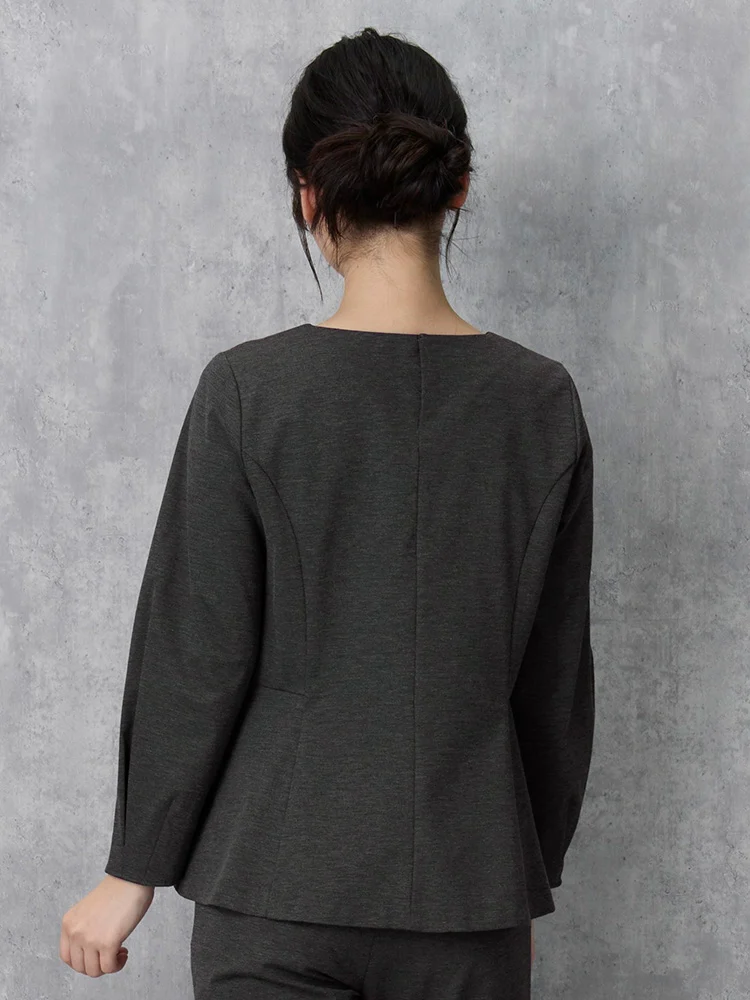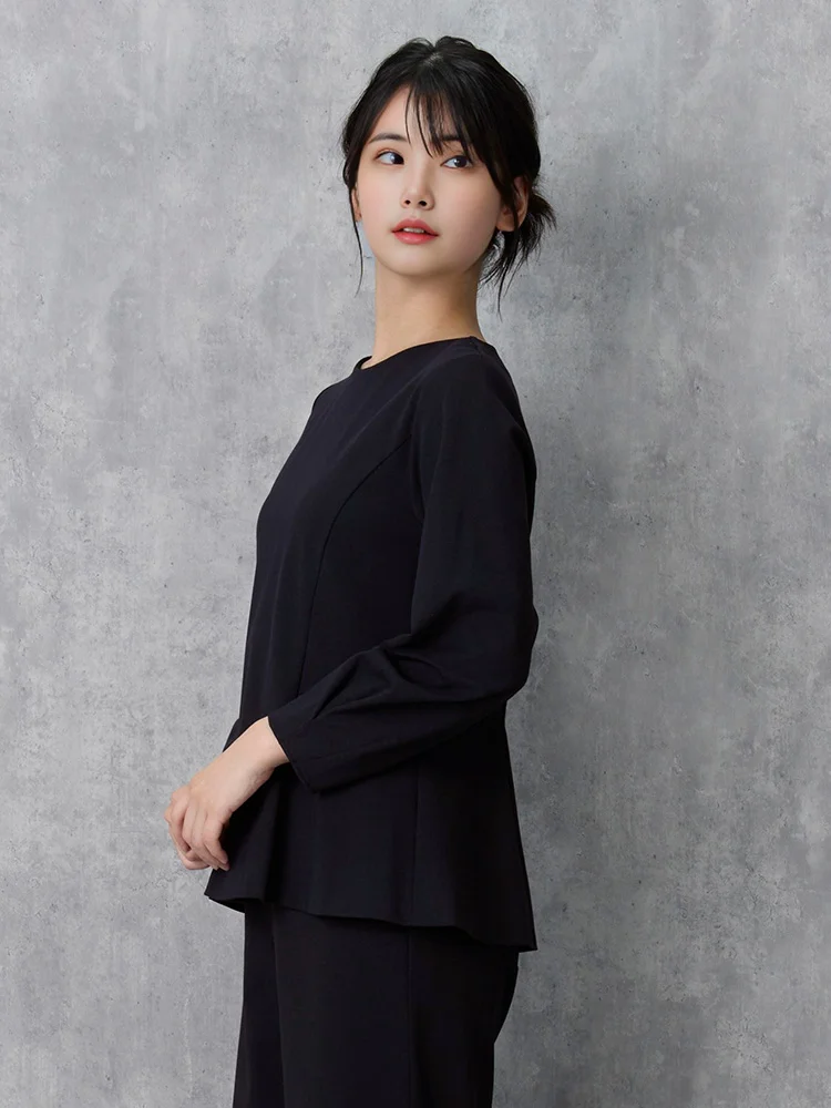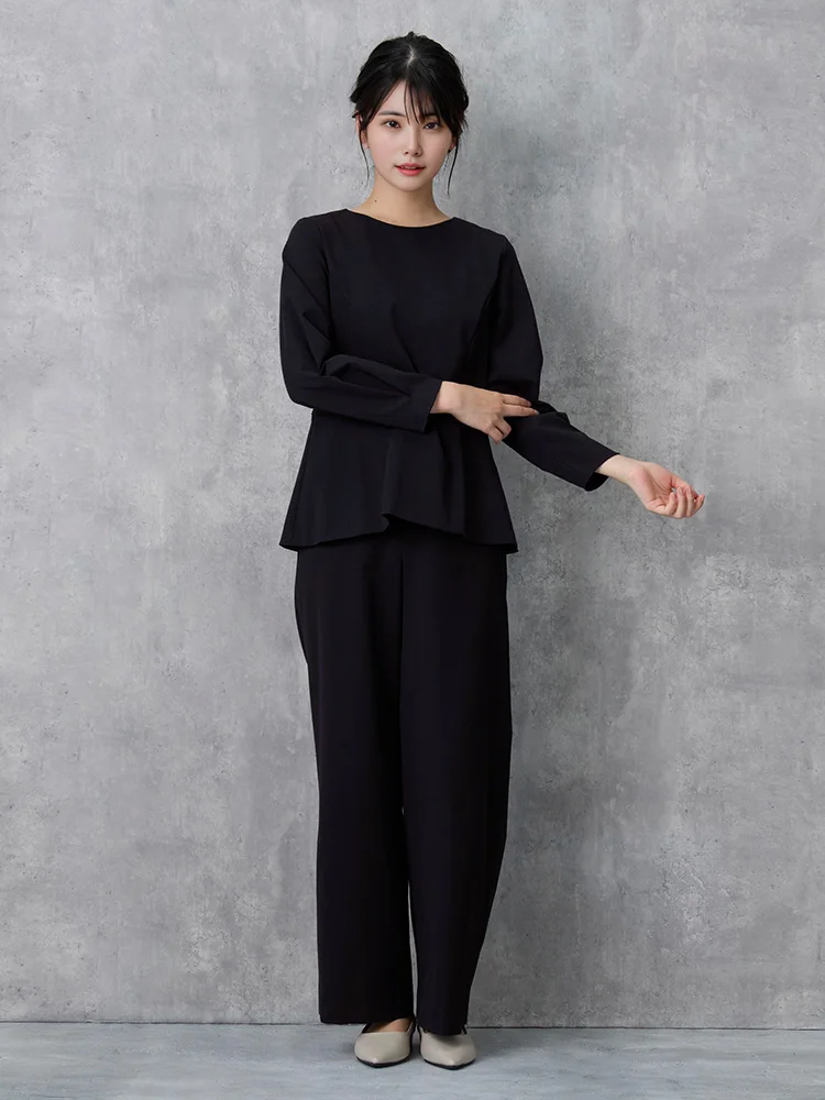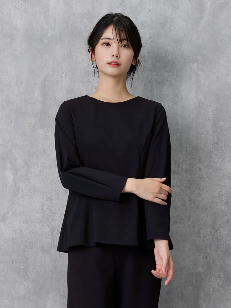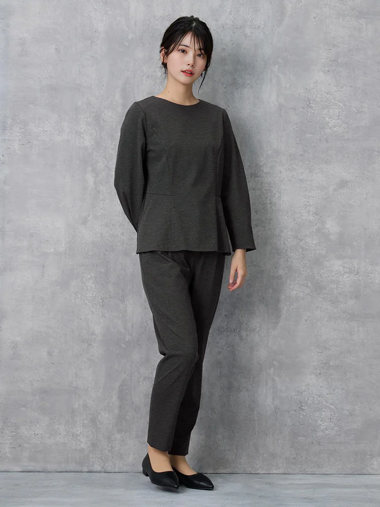 ウェストをやや絞り裾に向かって広がるペプラムブラウスです。