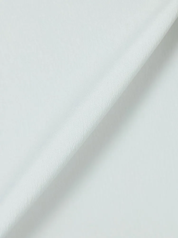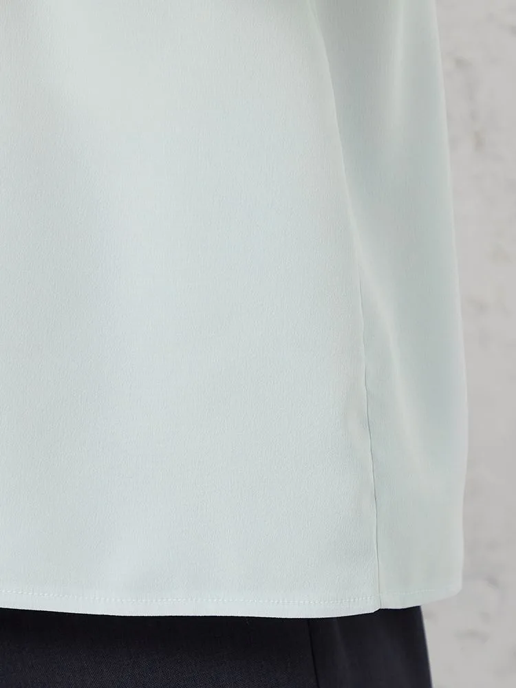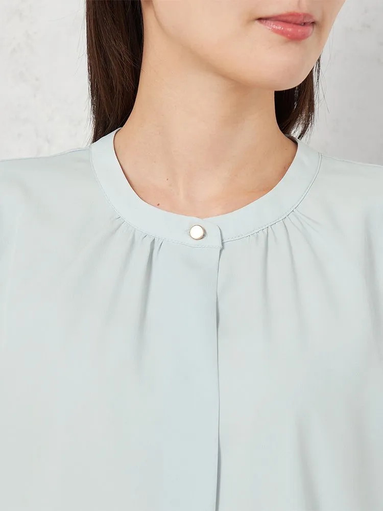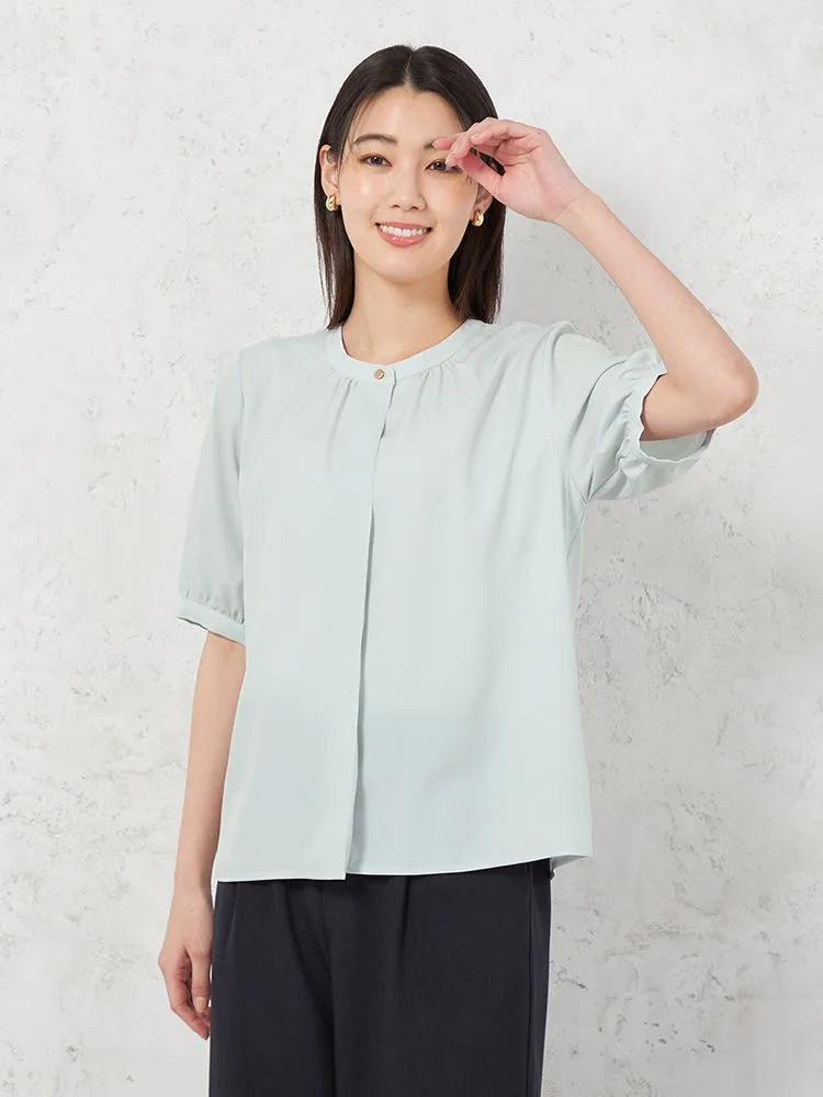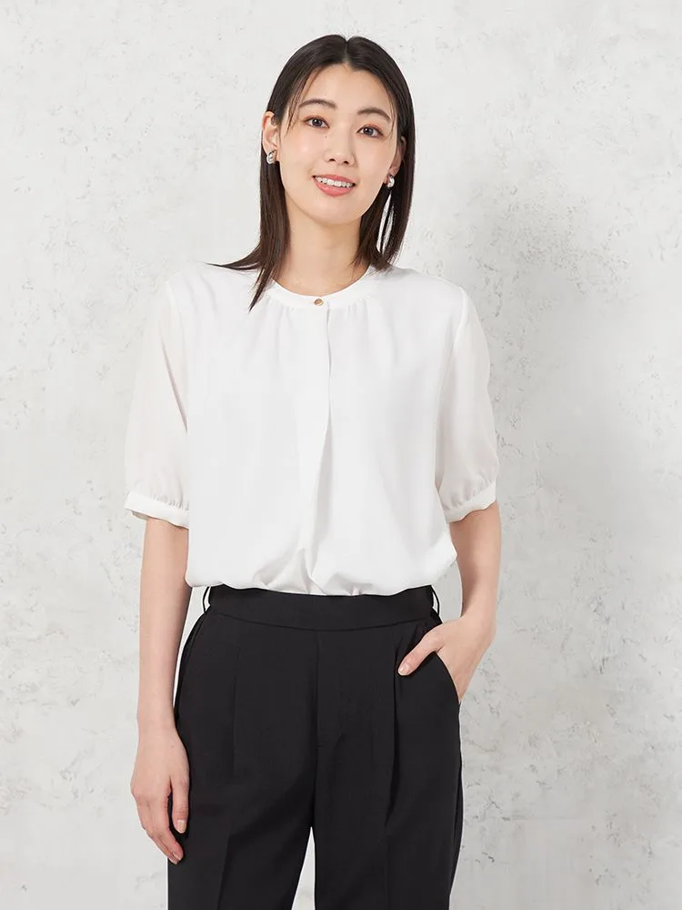 身頃2枚仕立てで1枚で着用しても下着が透けにくく、また、袖丈長めの5分袖でオフィスでも安心して着用できます。