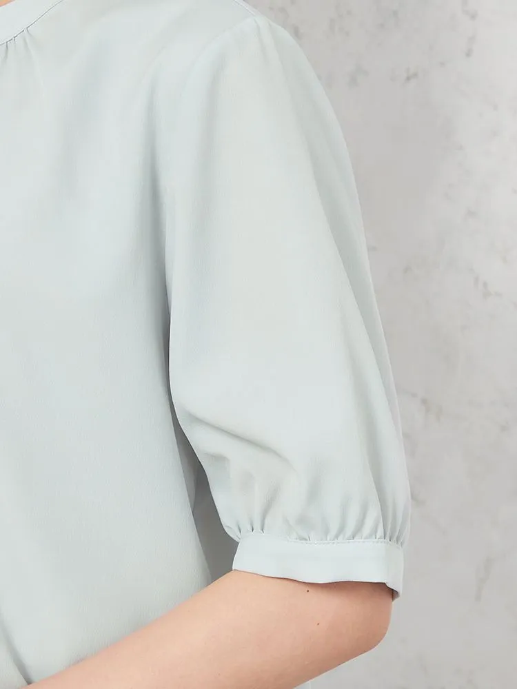 丸みのあるシルエットが優しい雰囲気のシンプルな5分袖のブラウスです。