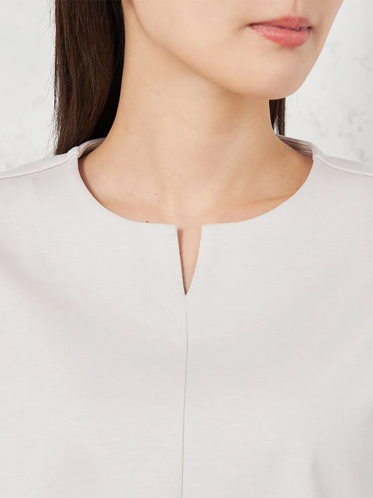 前中心にスラッシュ開きと接ぎを入れ、体のラインをさりげなくスラっと縦長に見せてくれます。
