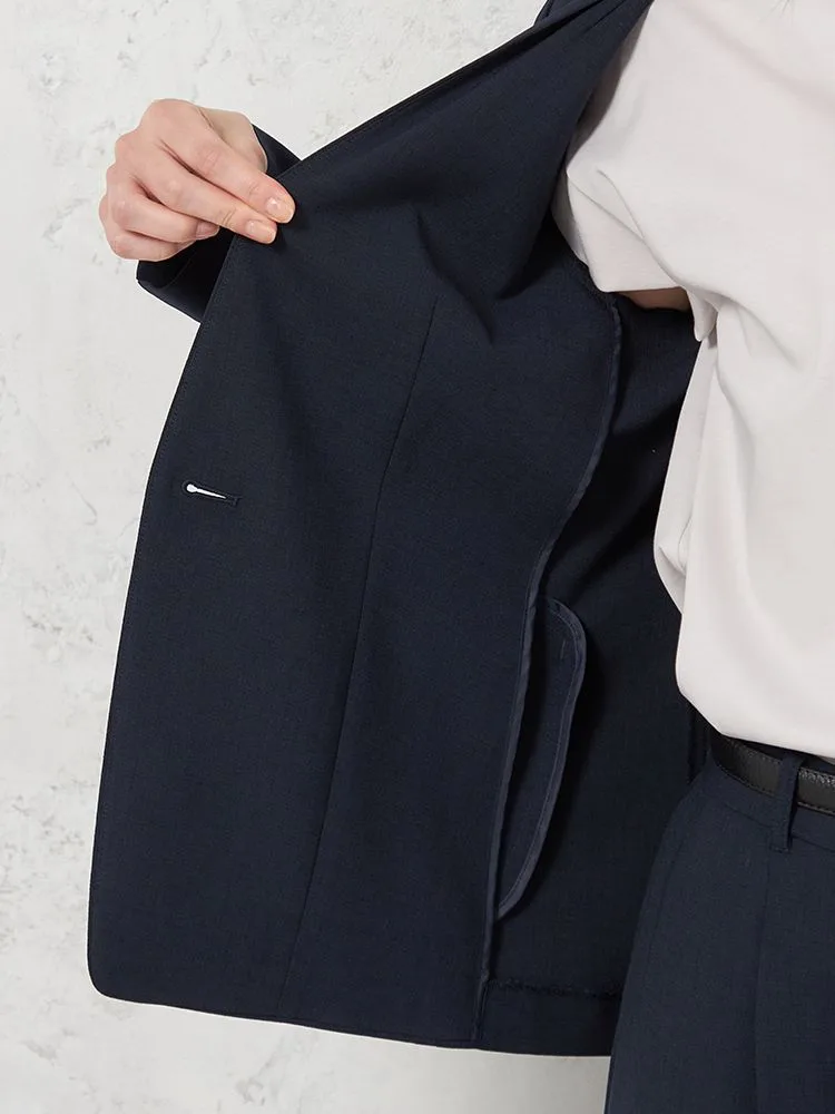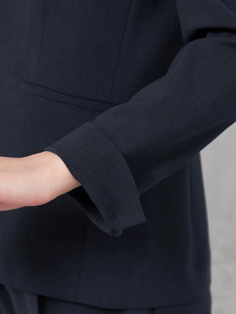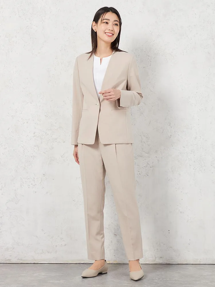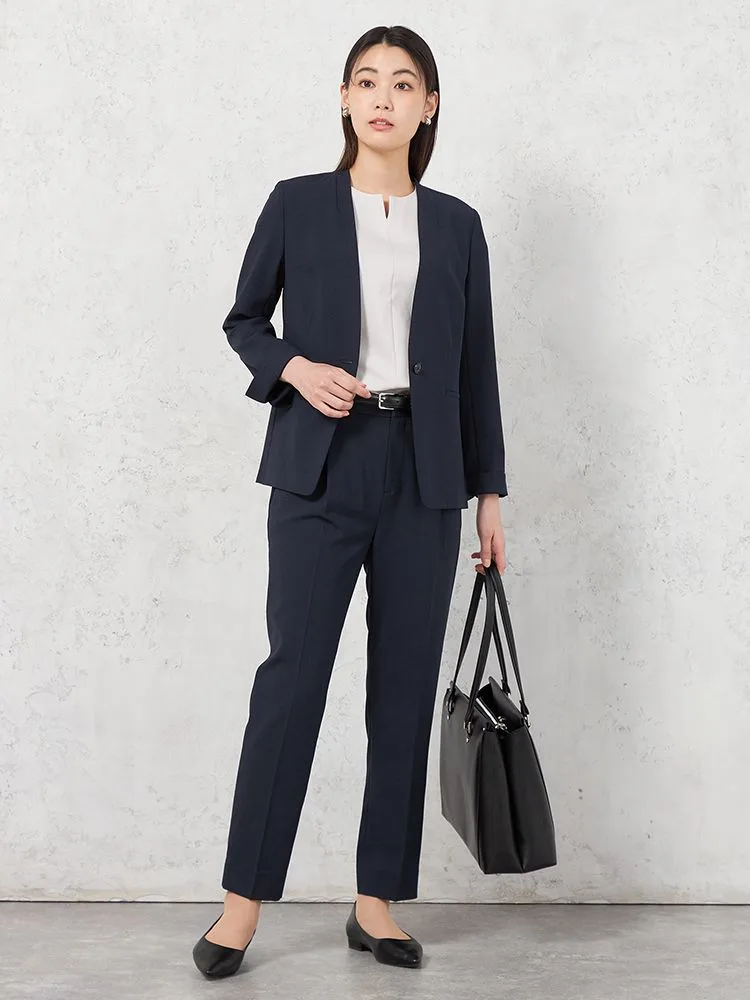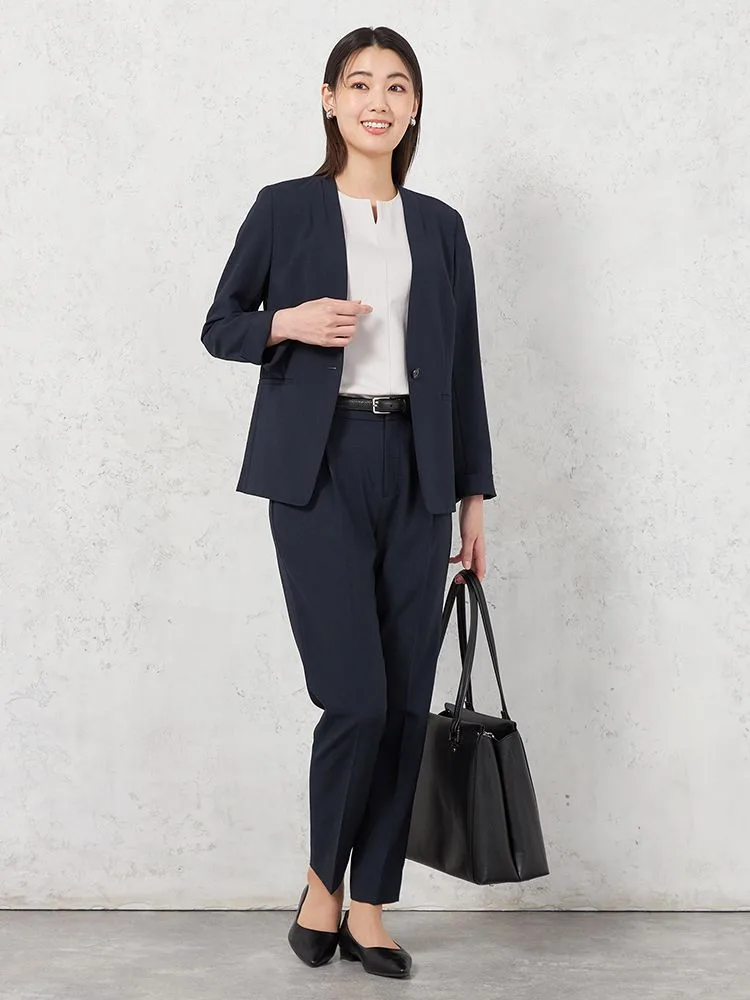 ジャケットはきちんと感を演出しつつ、肩パッドや裏地を無くすことでカチッとしすぎず軽く楽に羽織ることができます。