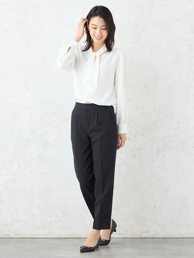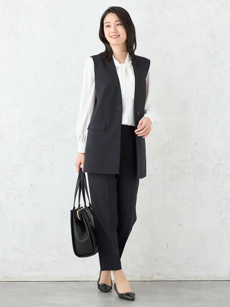 モダンなフォーマルを叶えるボウタイブラウス、ジレ、パンツの3点セット。