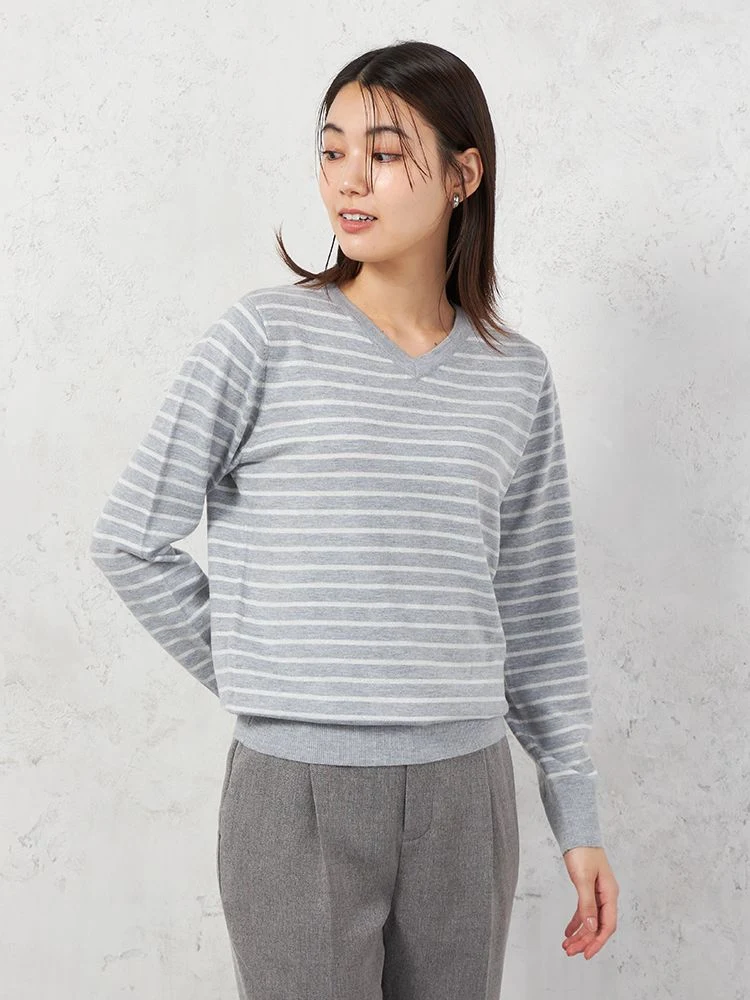 【INDIVI】Vネックプルオーバーニット ウォッシャブル デオドラント ボーダー 秋冬【レディース】