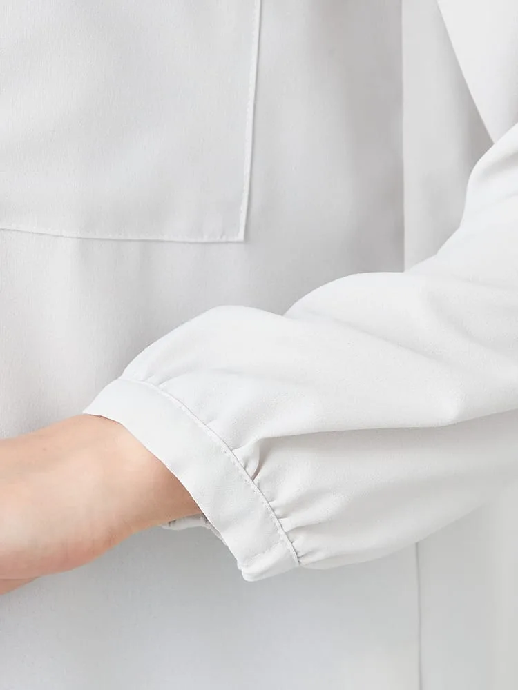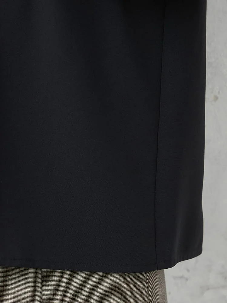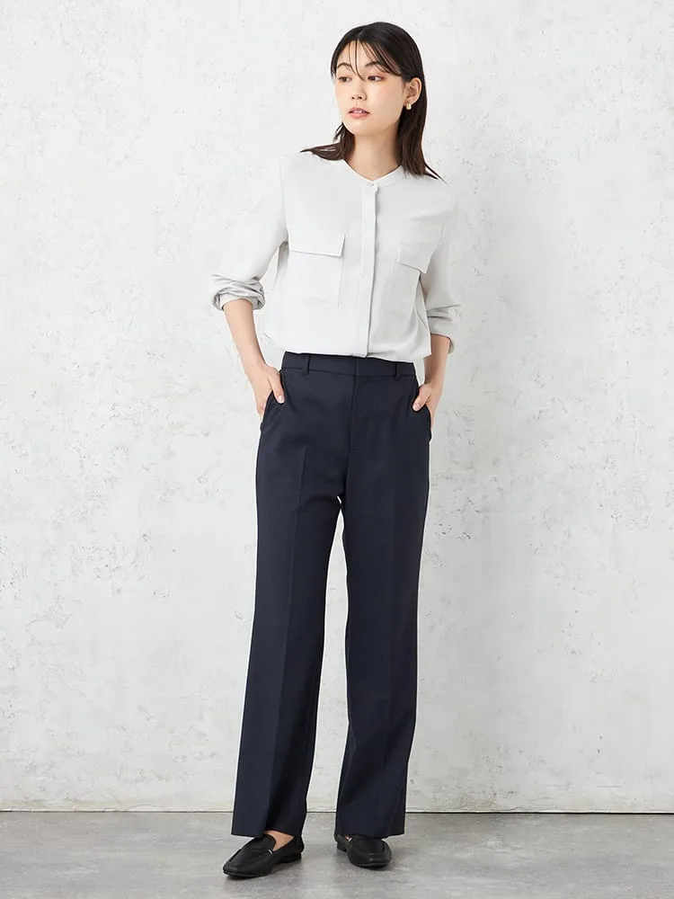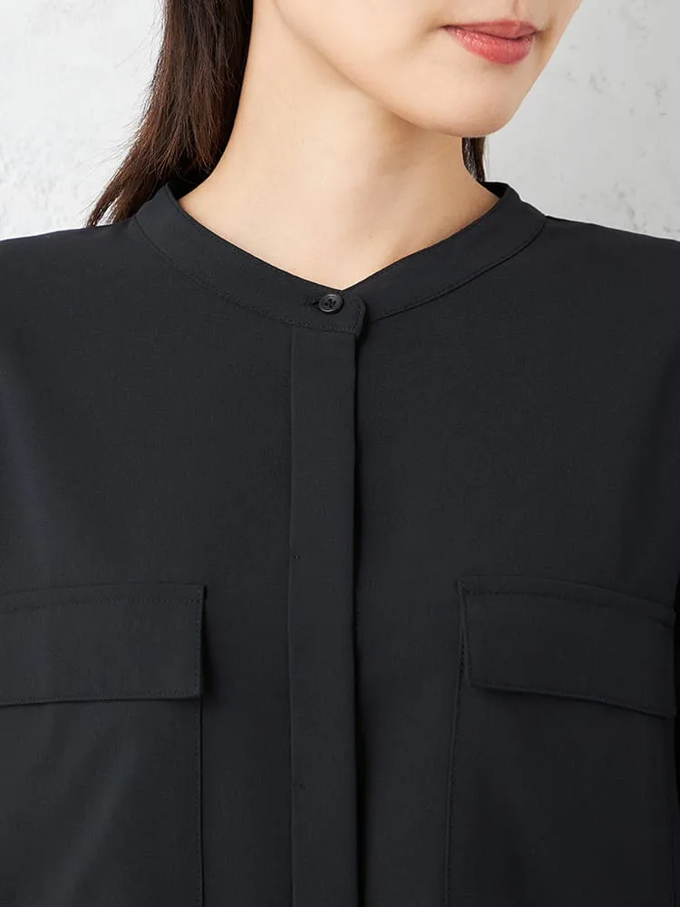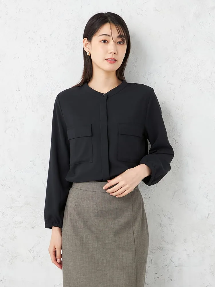 すっきりとした前開きのバンドカラーブラウスで、ネックラインが美しく見える仕立てです。