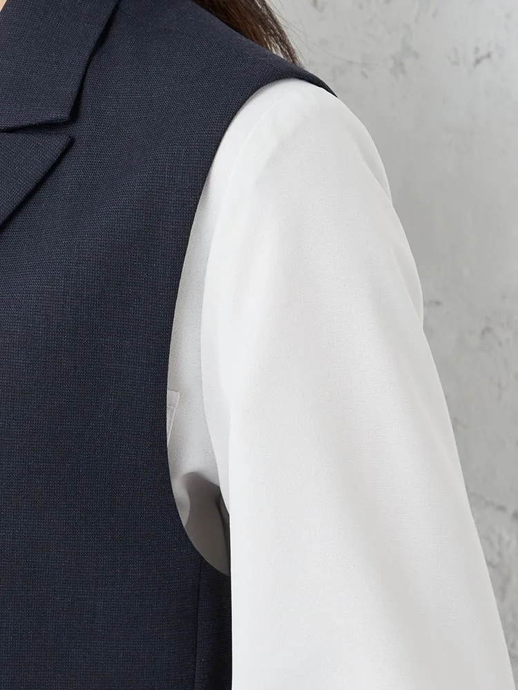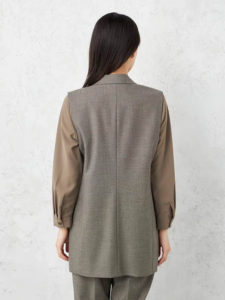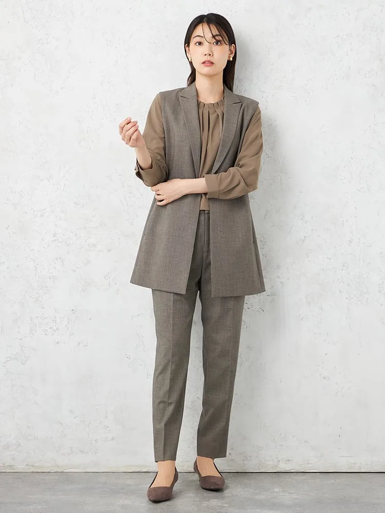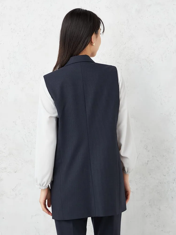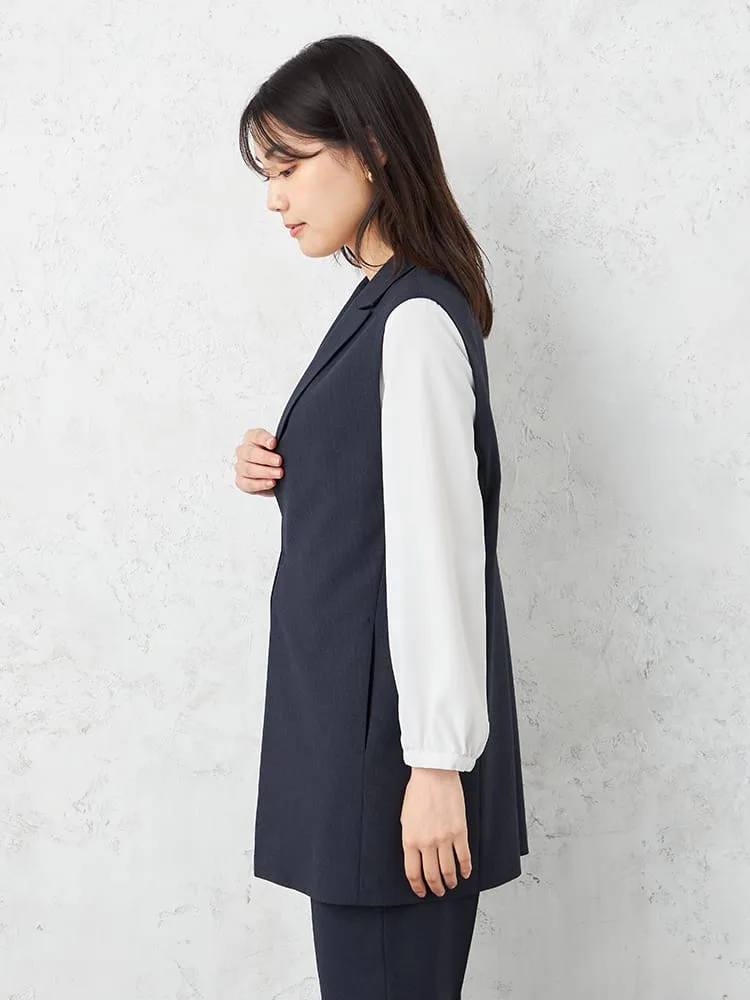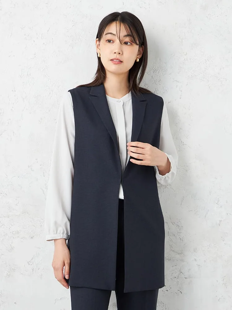 衿付きのテーラードタイプできちんと感をキープしたベスト。釦をつけずシンプルに仕上げました。