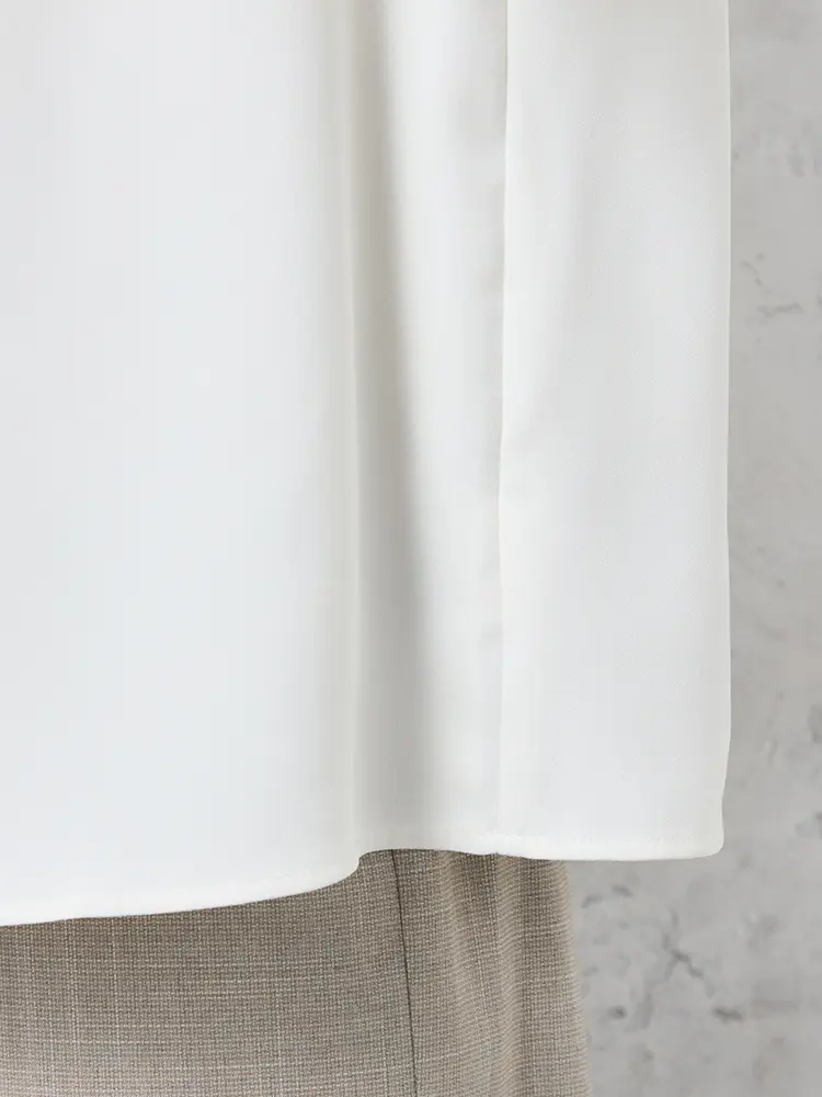 顔まわりをすっきりと見せてくれるバンドカラーにタックのあしらいで、さりげない華やかさをプラスしました。