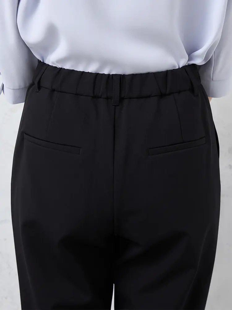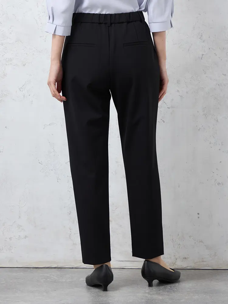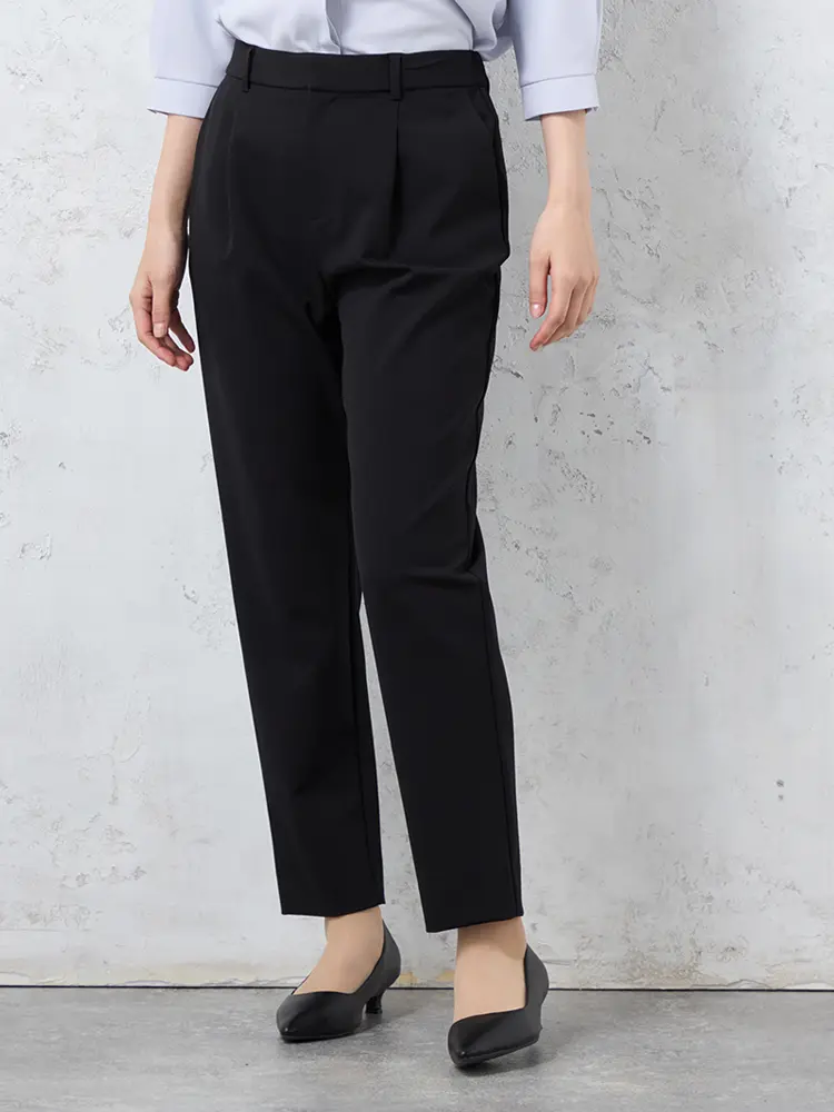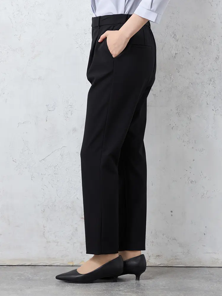 腰まわりに立体感を与えるワンタック仕様のテーパードパンツ。