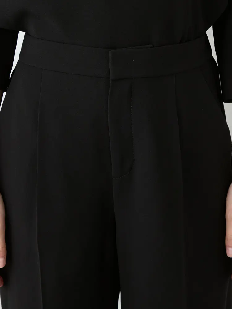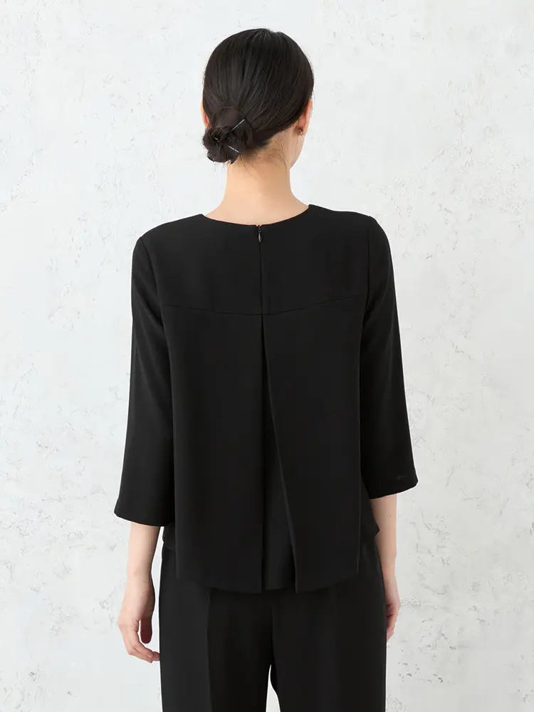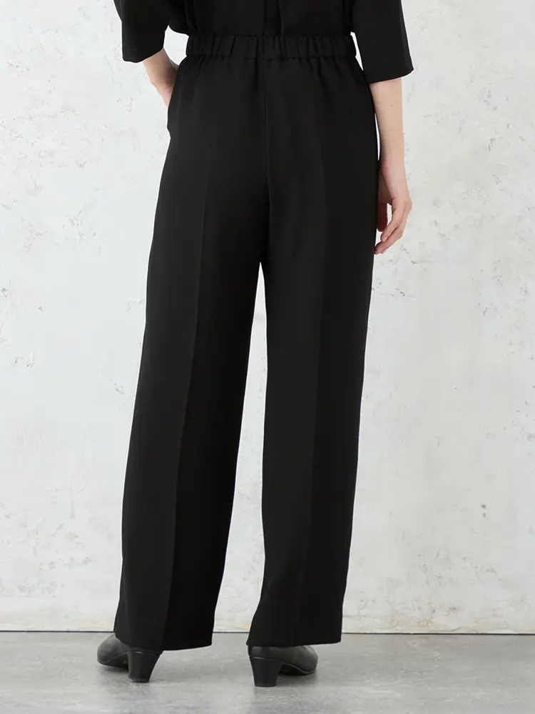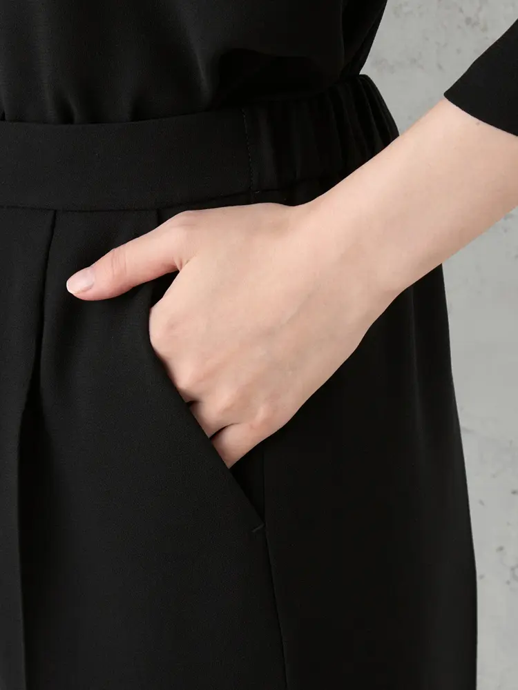 総裏のカラーレスジャケット、前タックが映える7分袖ブラウス、後ろゴム仕様のワイドパンツのセットです。