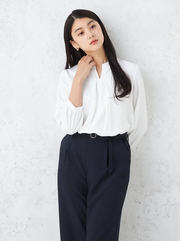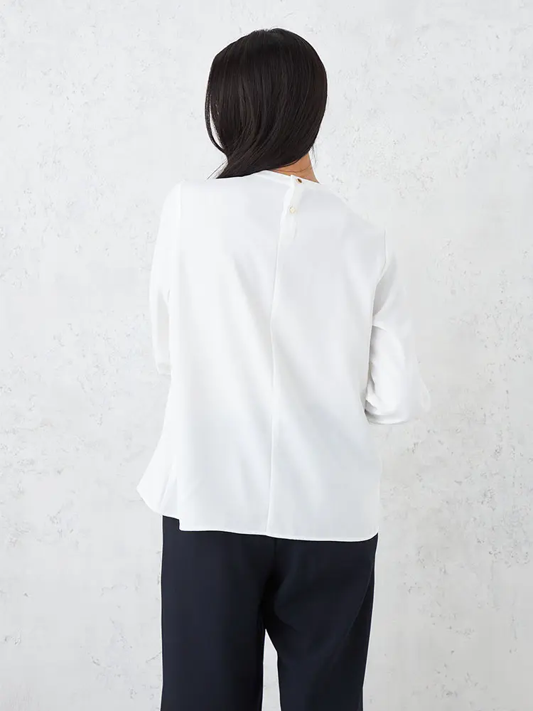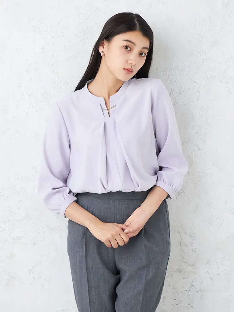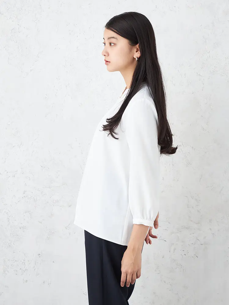 顔まわりをすっきりと見せるキーネックの7分袖ブラウス。