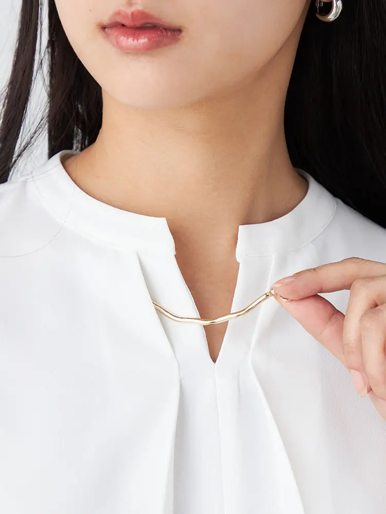 シャープなV字カットにタックの華やかさと、着脱可能なメタリックバーを添えた2WAY仕様。