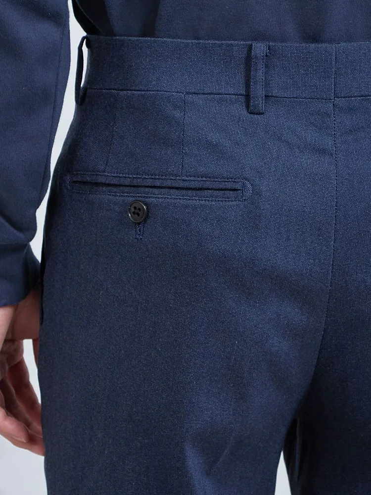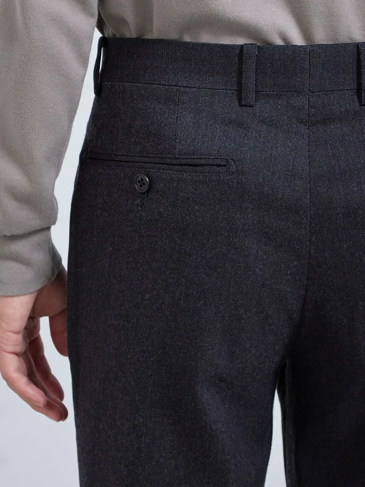 パンツの腰回りに生地の折り込みがなく、スッキリとしたシルエットを実現します。シンプルで洗練された印象を与え、すっきりとした着こなしが可能です。
