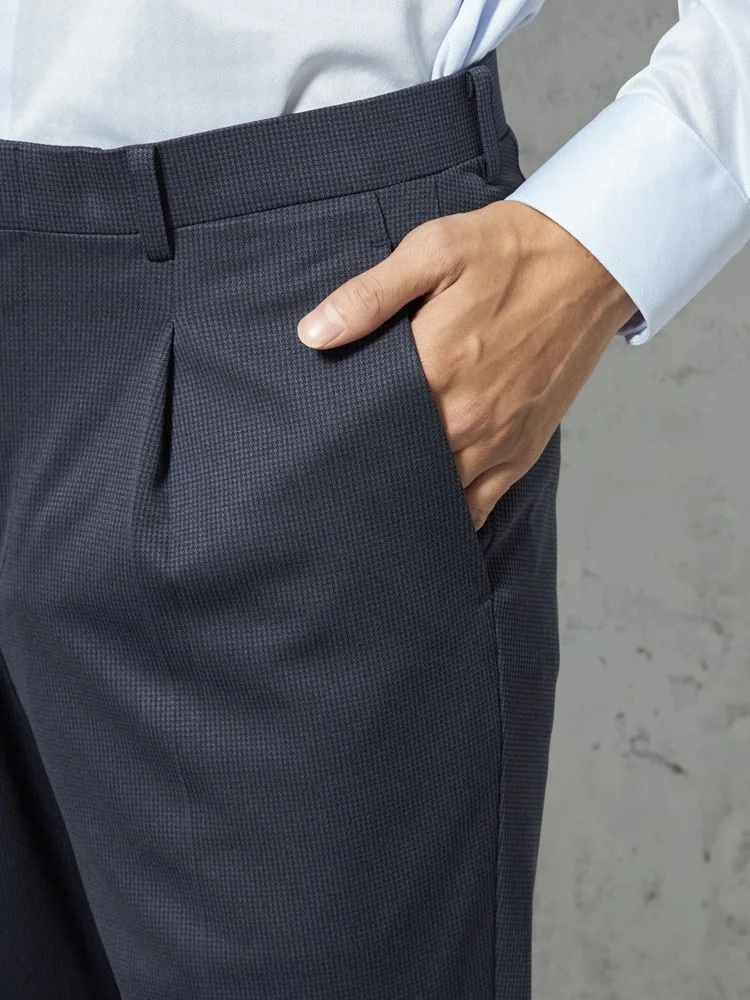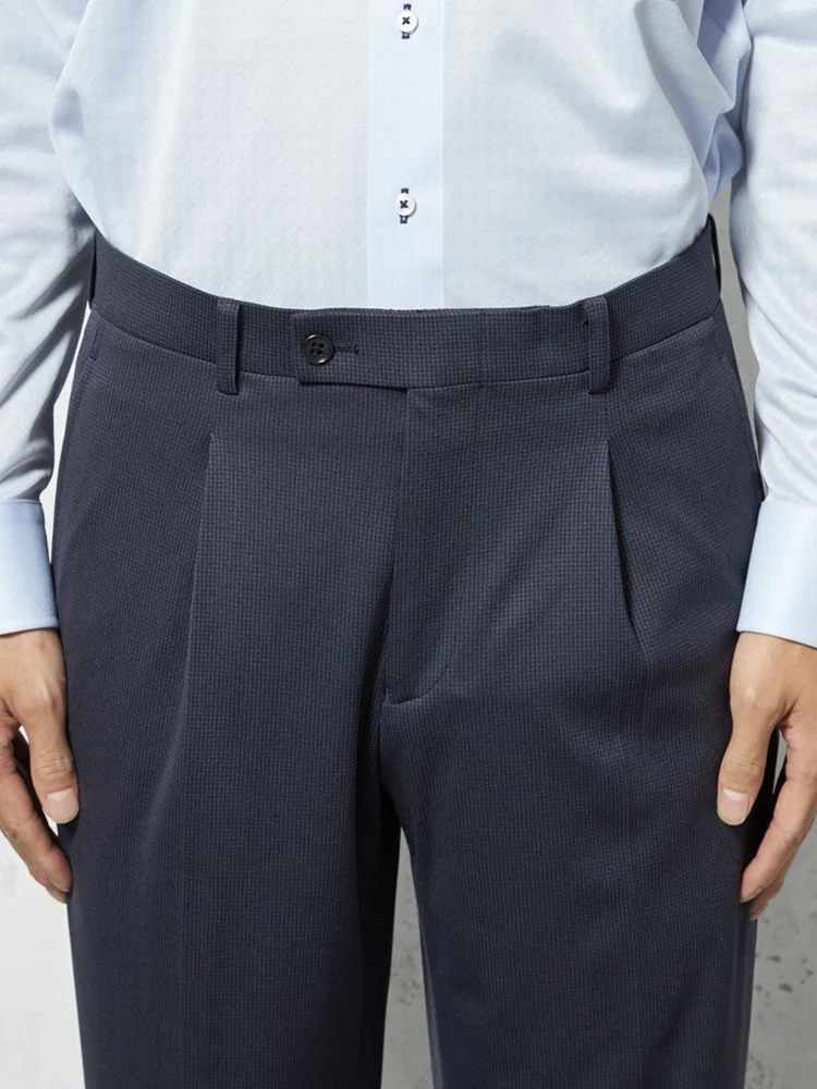無地に近い感覚で取り入れやすい、細やかな千鳥格子柄のスラックス。