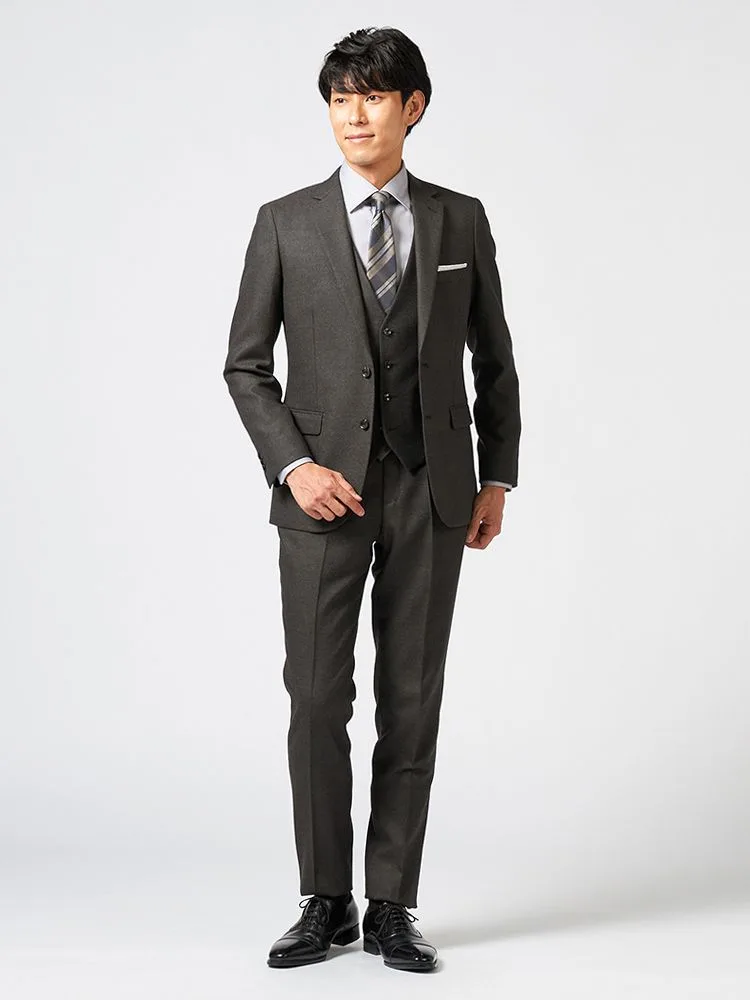 【上下ウォッシャブル】スリーピーススーツ 2つボタン ウール混 ストレッチ・防しわ 無地 nero 秋冬【スリムデザイン】(カーキー)