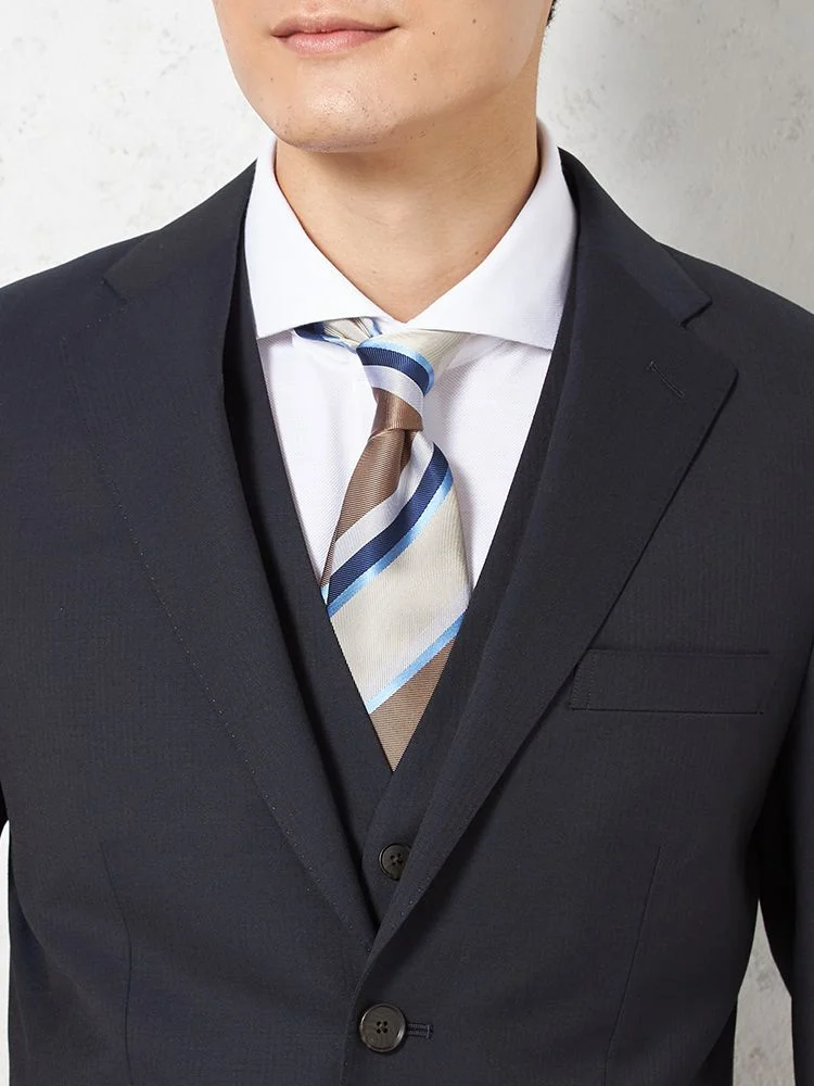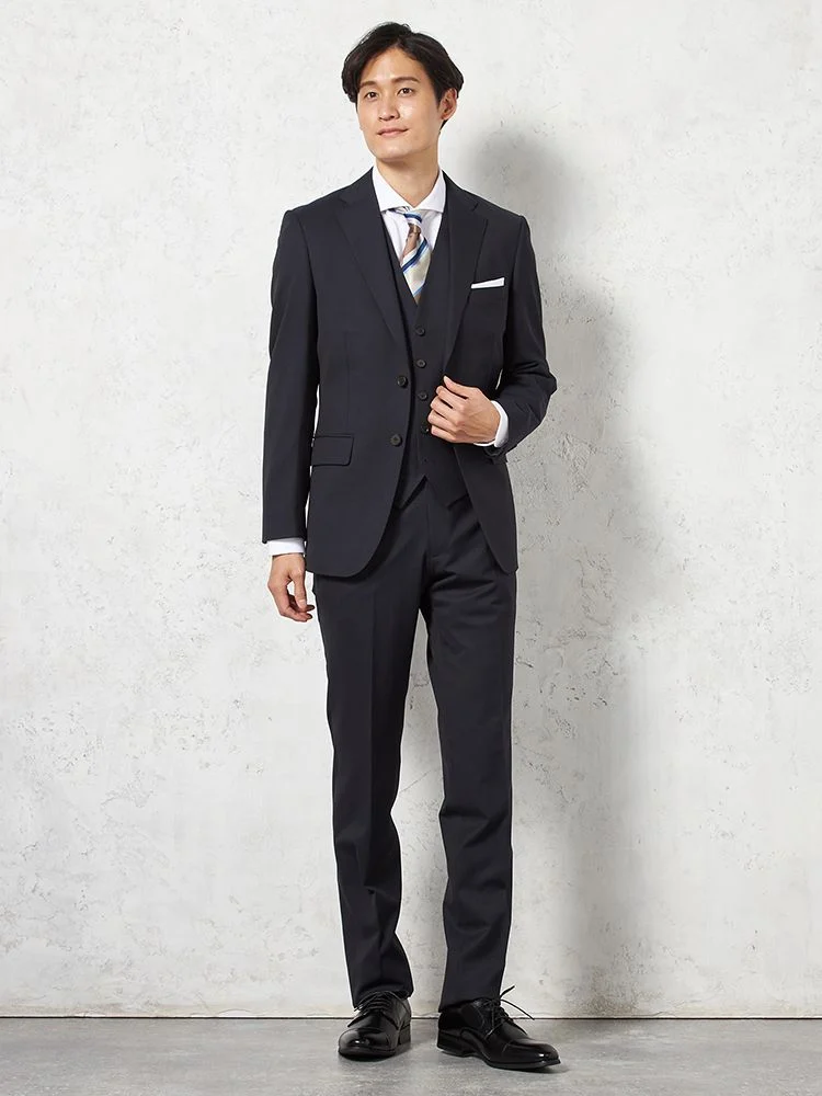 ジャケット、パンツ、ベストの3点セットで、スーツ全体を簡単にコーディネートできます。ビジネスやフォーマルな場面に最適です。