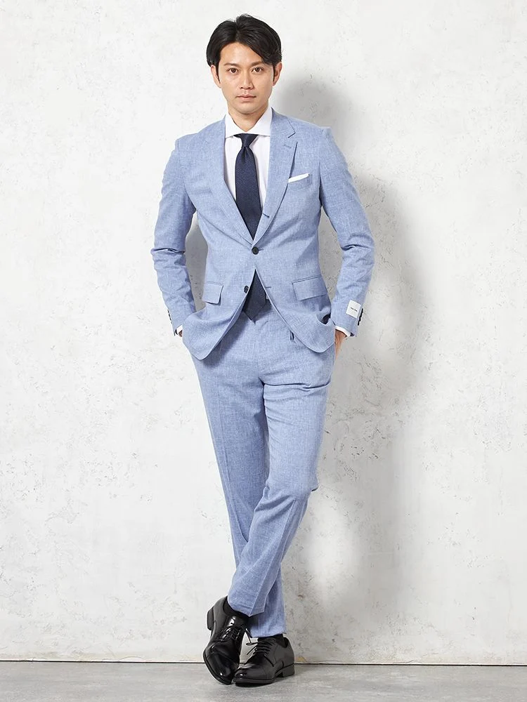 【パンツウォッシャブル】スーツ 段返り3つボタン リネンライク ライトフィール ドライタッチ 軽量 ブルー リッケンバッカー 春夏