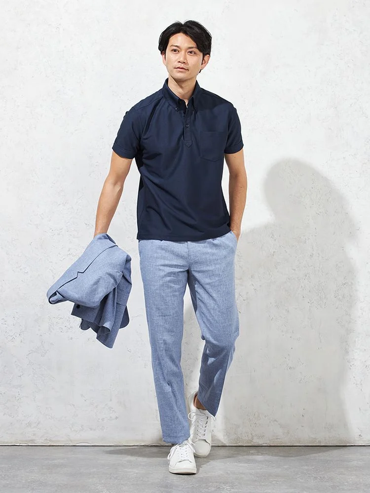 スラックスはワンタック入りで腰回りにゆとりがあります。