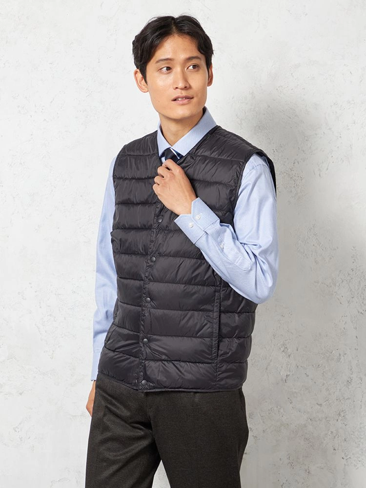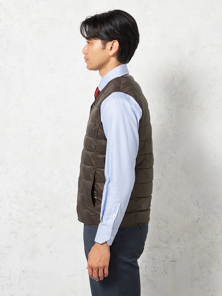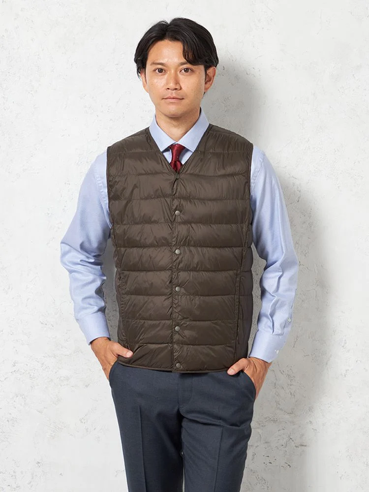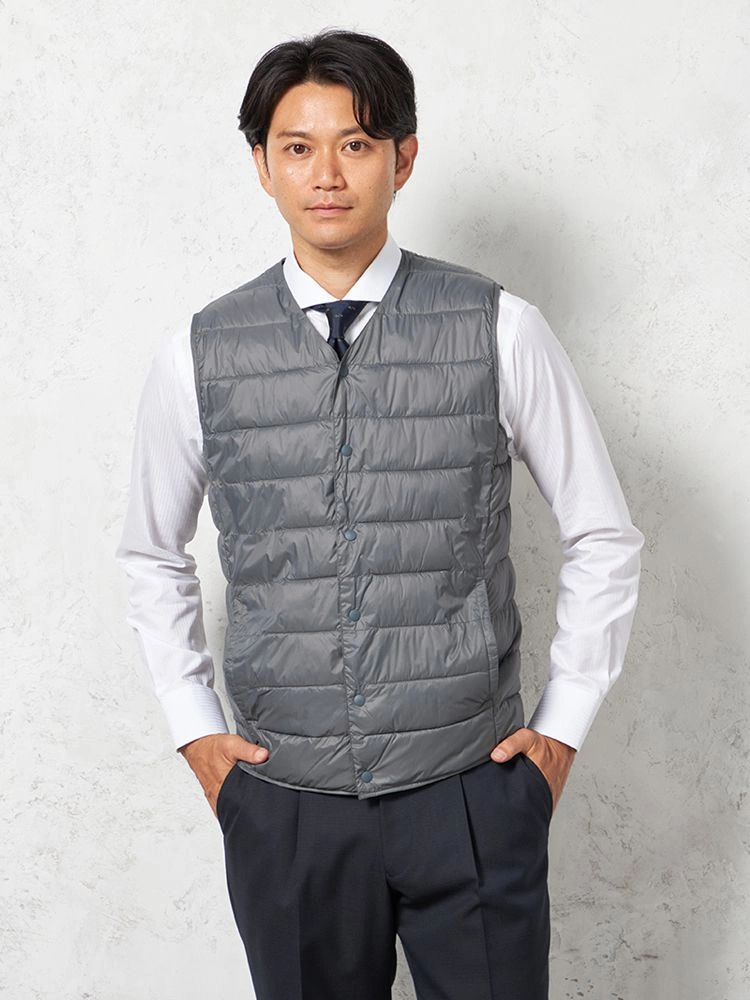 さらりと羽織れるライトなアウターとしても、ジャケットのライナーとしても使用できる中綿Vネックベスト 。