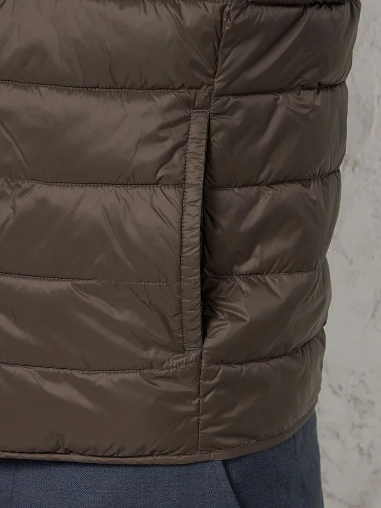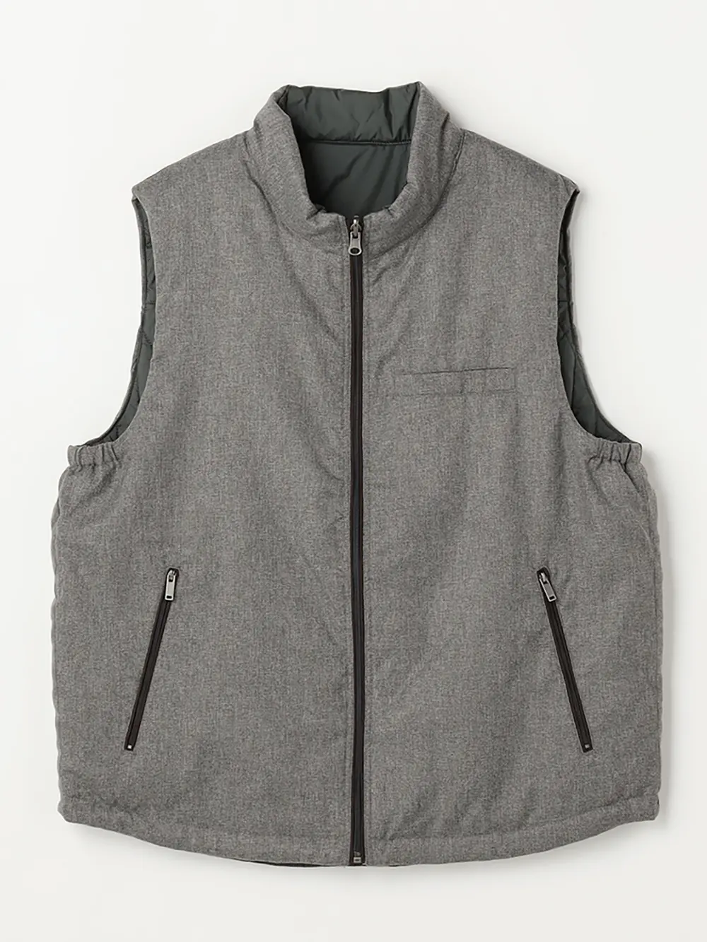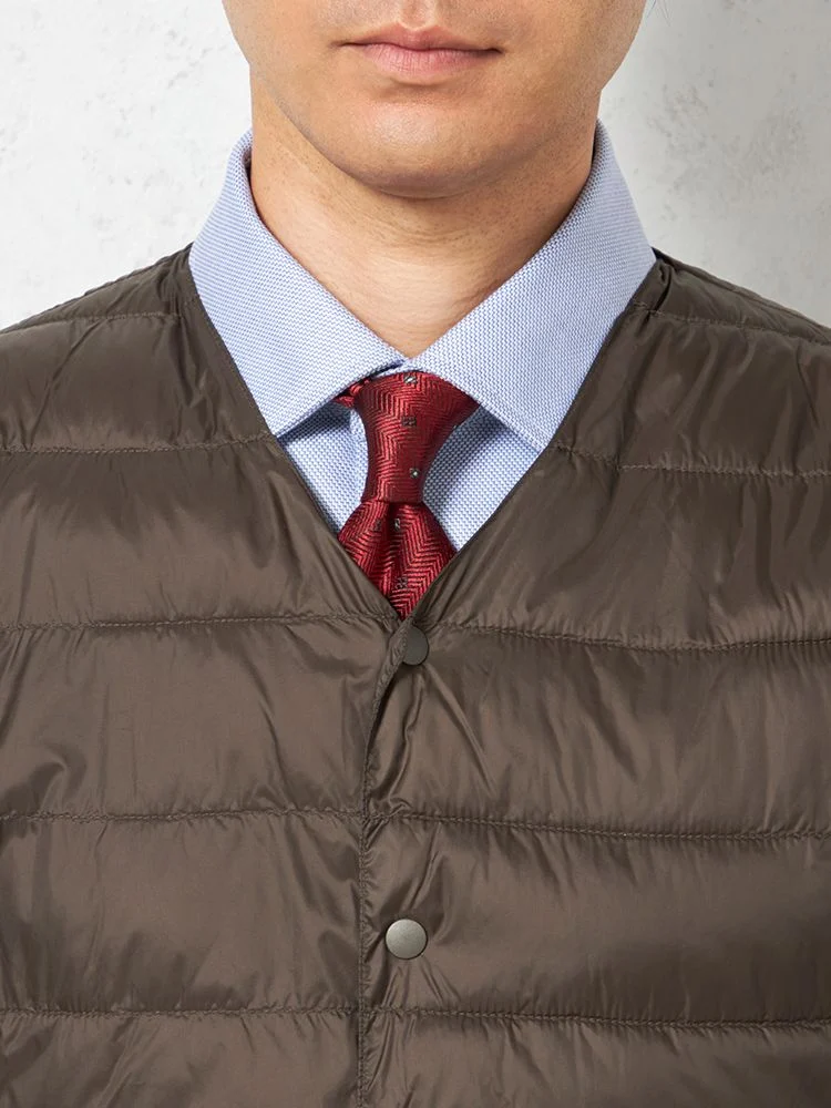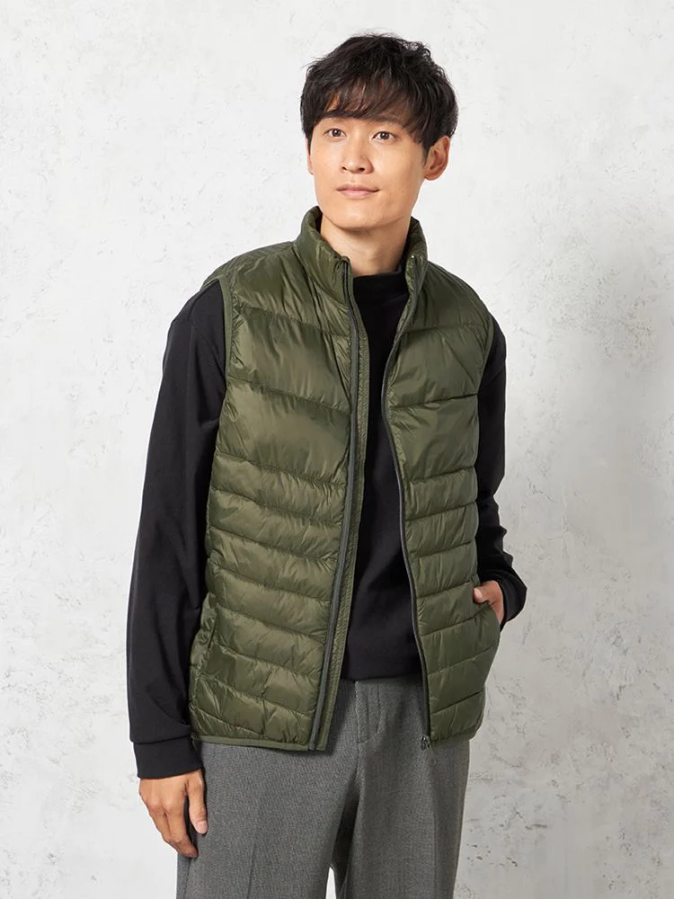 さらりと羽織れるライトなアウターとしても、ジャケットのライナーとしても使用できる中綿Vネックベスト 。