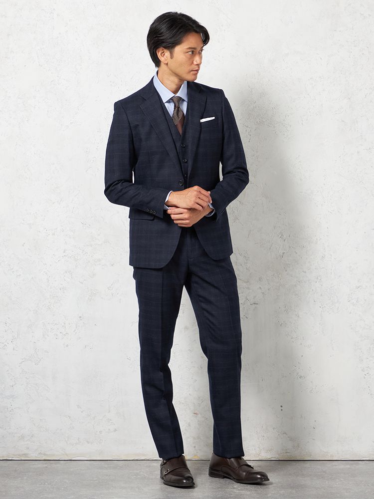 膨らみある三小糸使いで、暖かさと軽さを両立させた素材で仕立てたスリーピーススーツ。