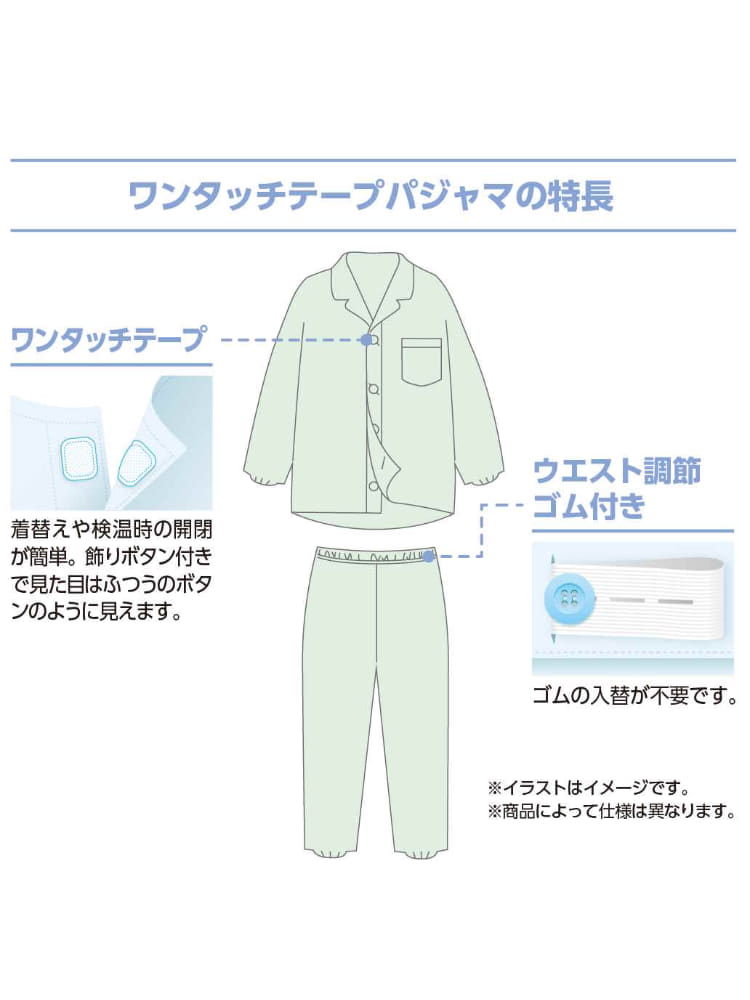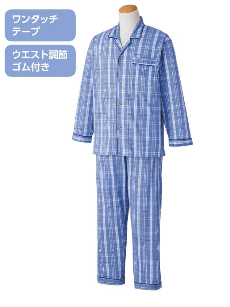 メンズ ワンタッチパジャマ/紳士用/年間素材/パジャマ/介護/入院/高齢者/ワンタッチテープ/飾りボタン/ウエスト調整ゴム/着替えやすい/敬老の日/ギフト/プレゼント 【CF】(ブルー)