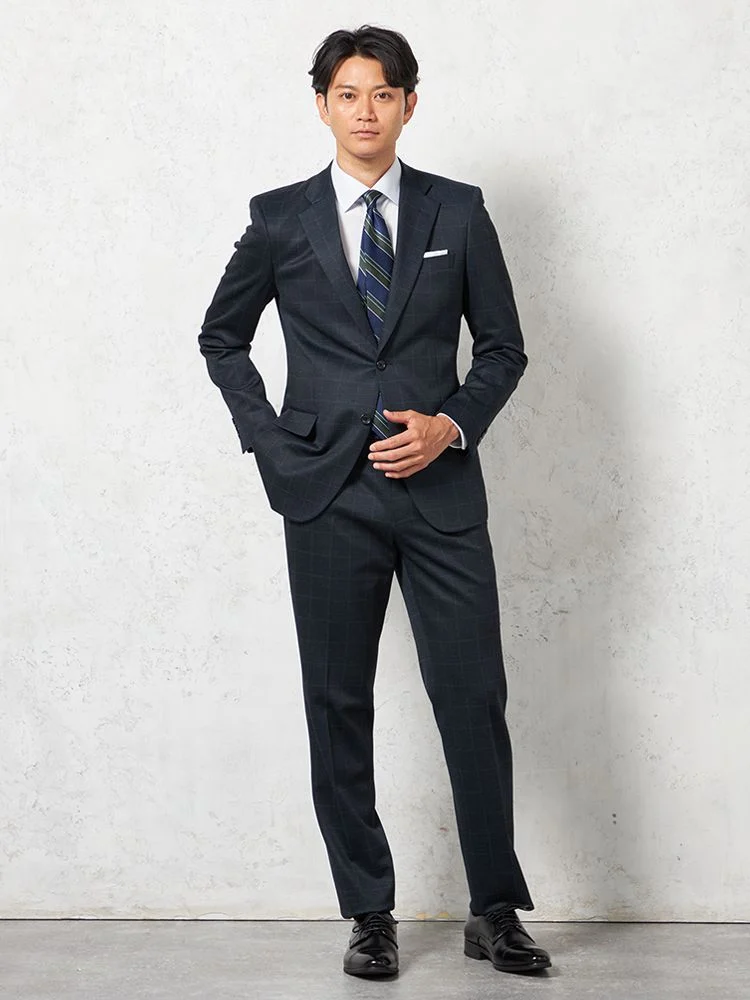【上下ウォッシャブル】スーツ 2つボタン ウールライク ウインドペン nero 秋冬【スリムデザイン】