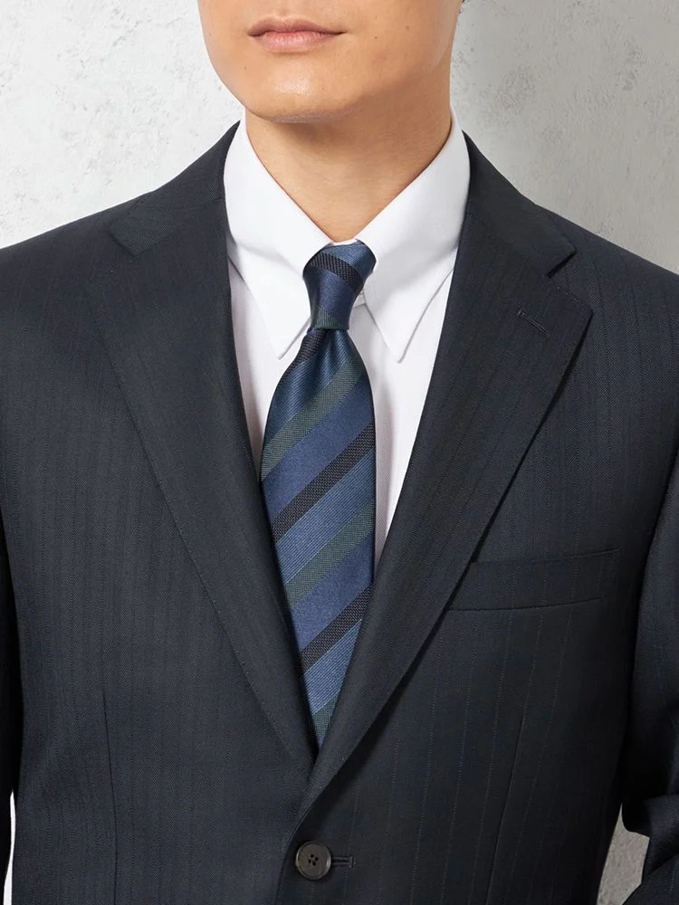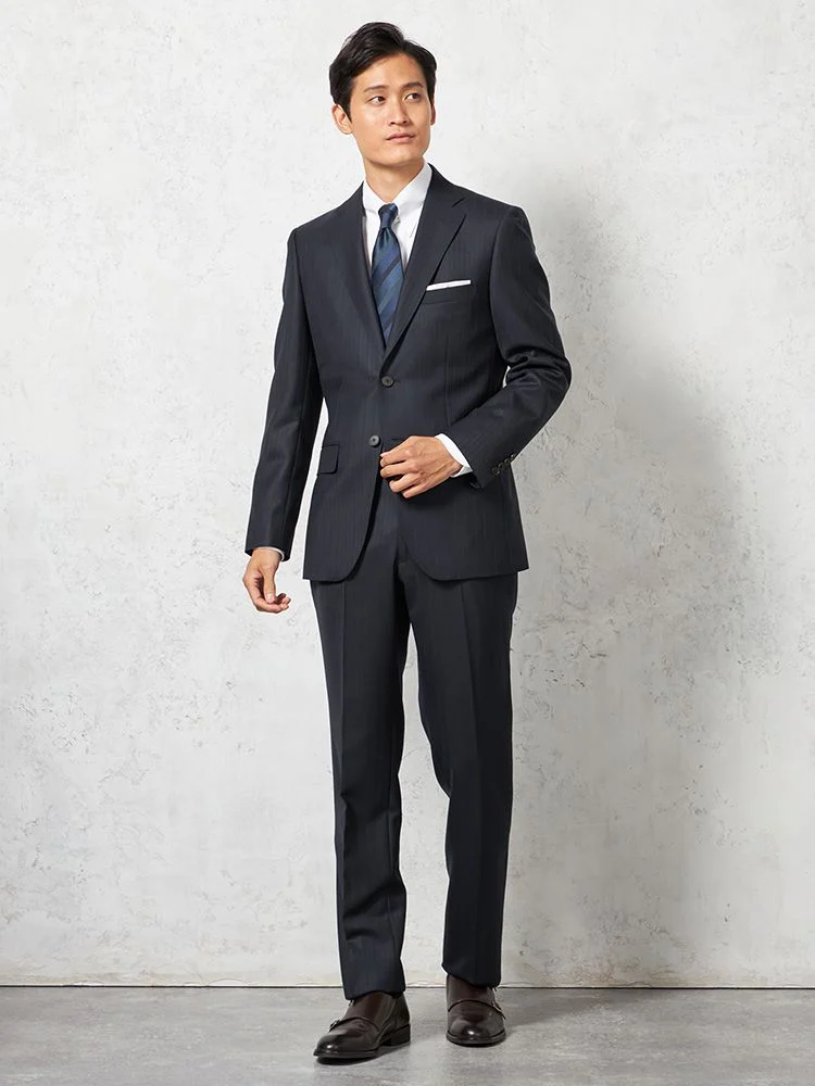 知的な印象を与えながらも、シャツやネクタイともコーディネートしやすいシャドウストライプ柄の2つボタンスーツ。