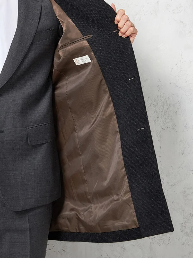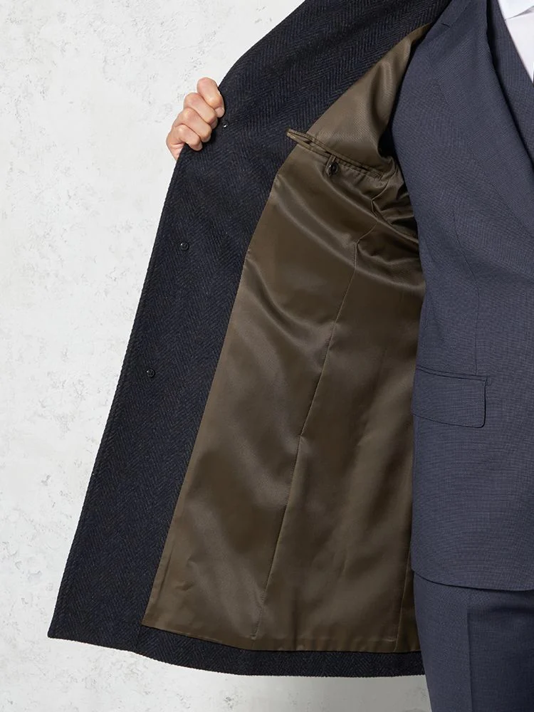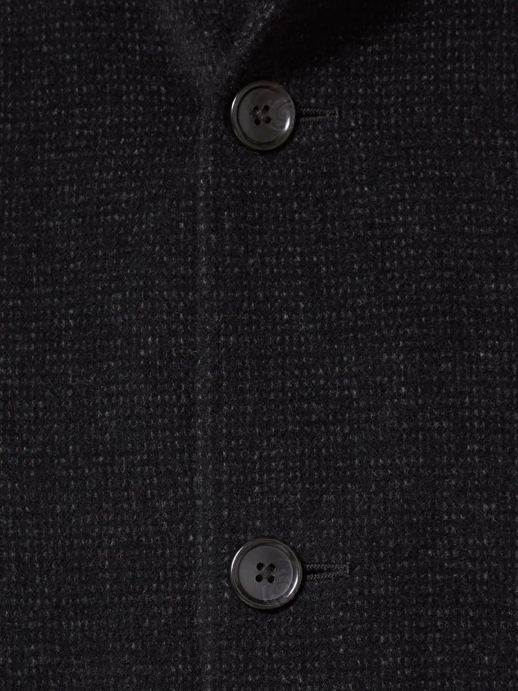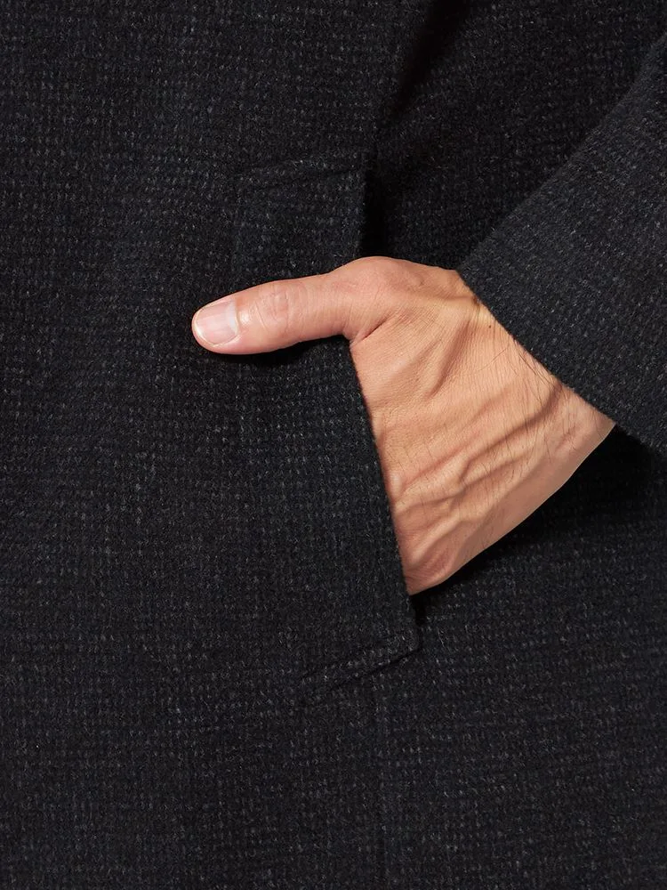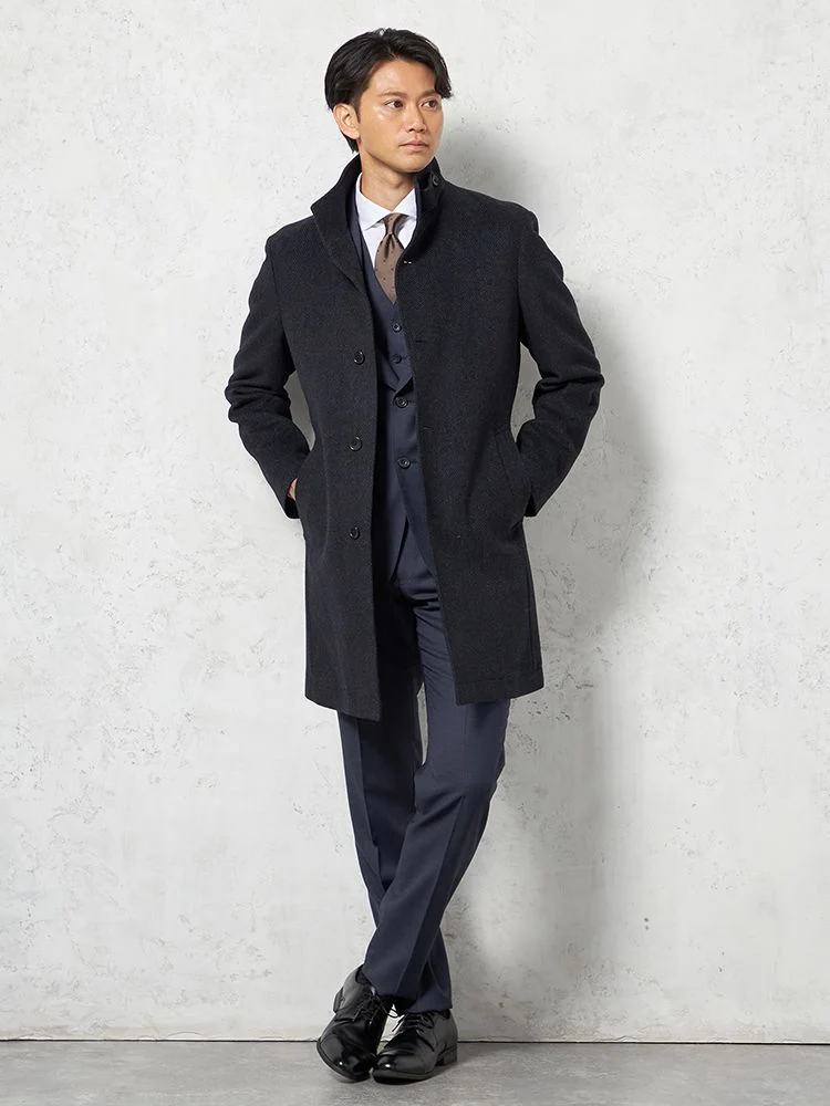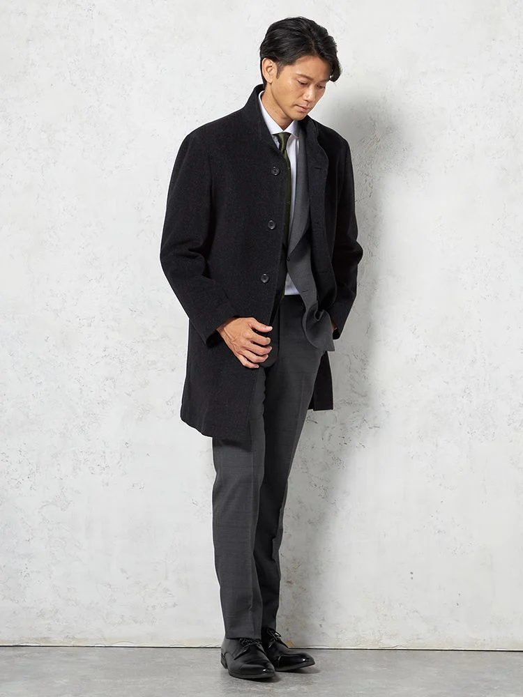 尾州産のアンゴラ混プレミアムウール素材を採用したコートは、上質で柔らかな風合いを楽しめます。