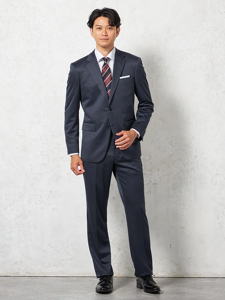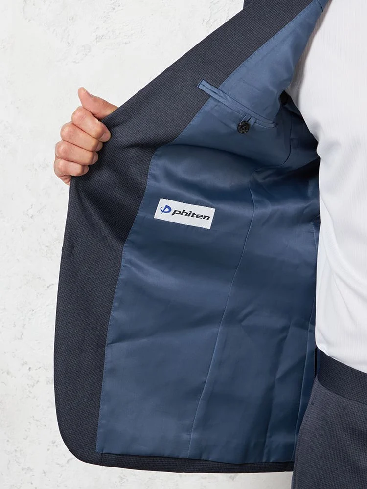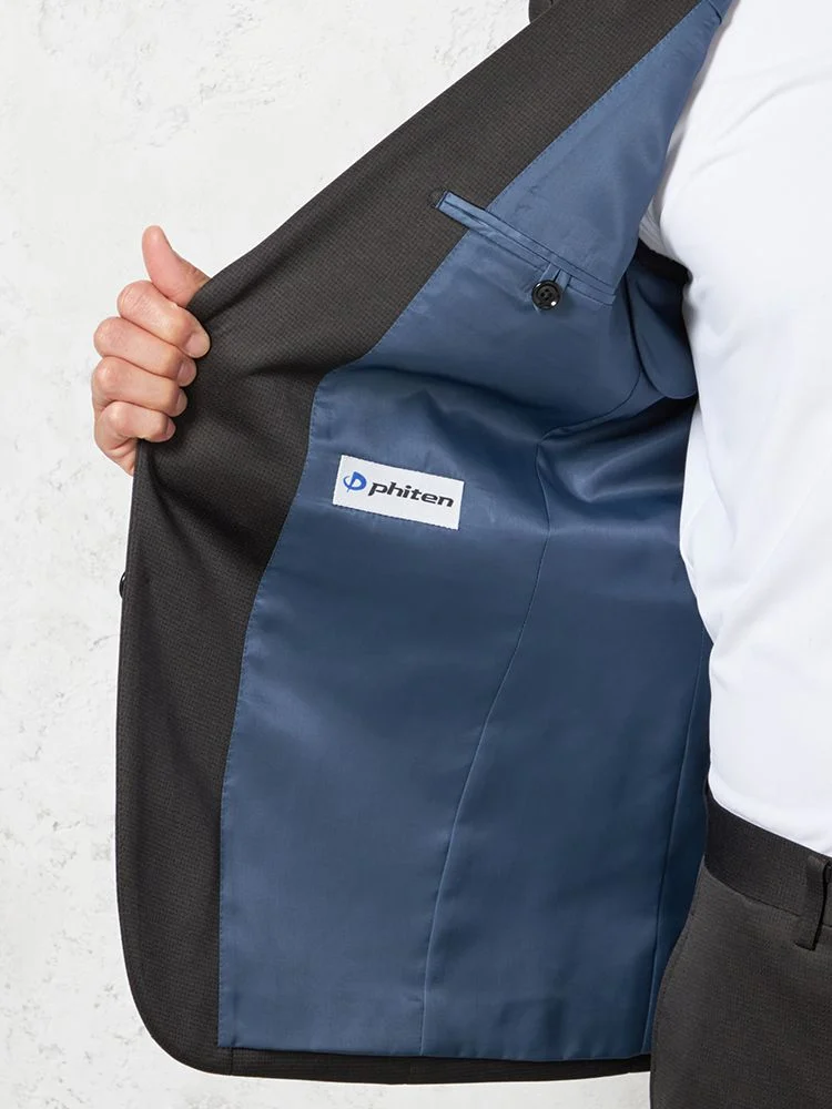 動きやすさときちんとした印象を兼ね備えたファイテン加工のニット地スーツ。