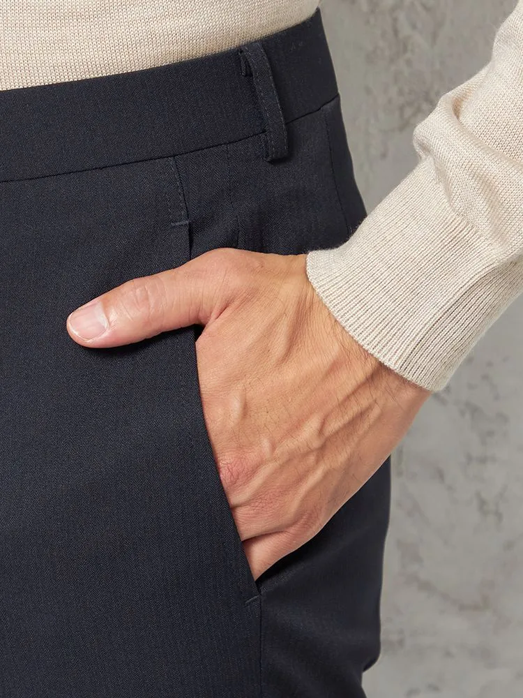 パンツの腰回りに生地の折り込みがなく、スッキリとしたシルエットを実現します。シンプルで洗練された印象を与え、すっきりとした着こなしが可能です。