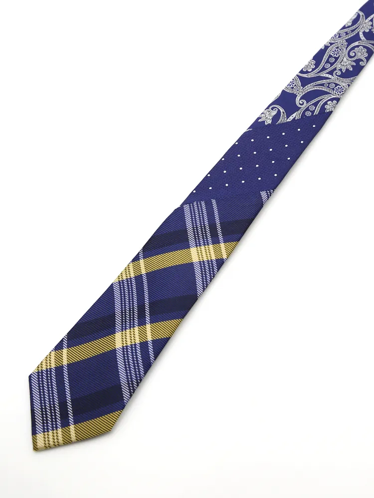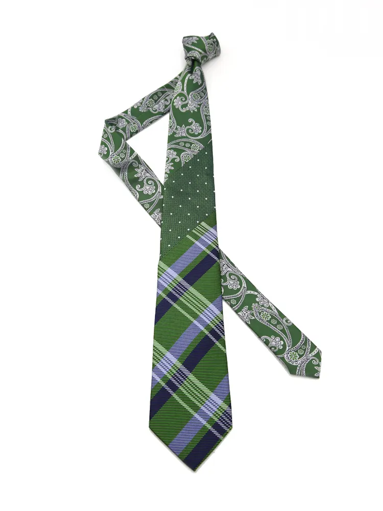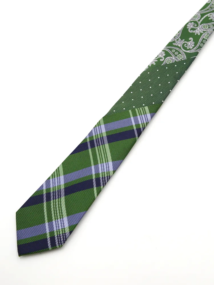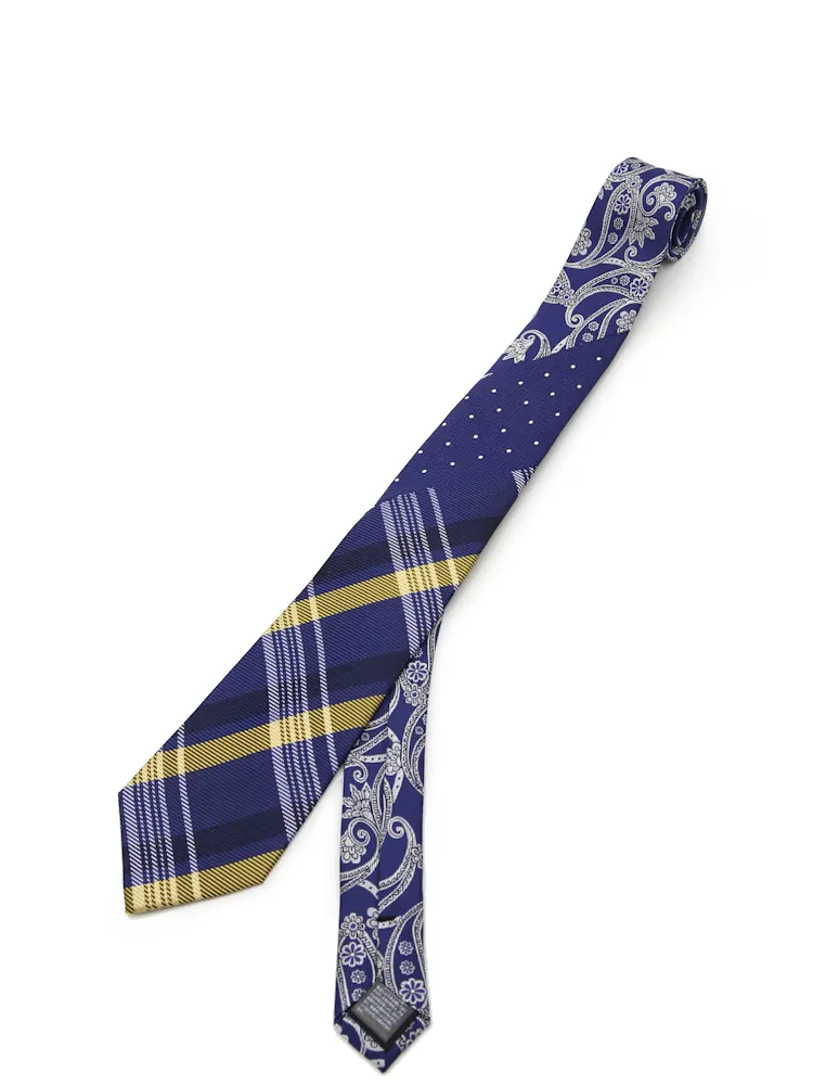 三種のシルク生地を縫い合わせて一枚の生地に仕上げたクレイジーパターンネクタイです。
