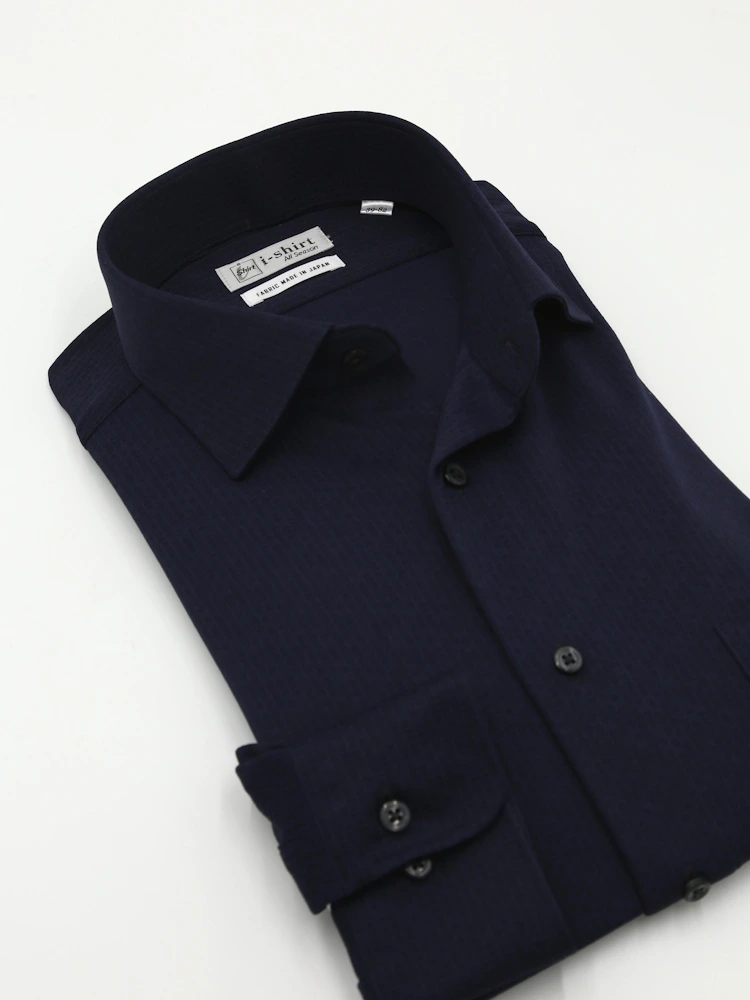 【完全ノーアイロン】長袖 アイシャツ セミワイド ストレッチ 防汚加工 織柄無地 ワイシャツ i-shirt 通年(ネイビー)