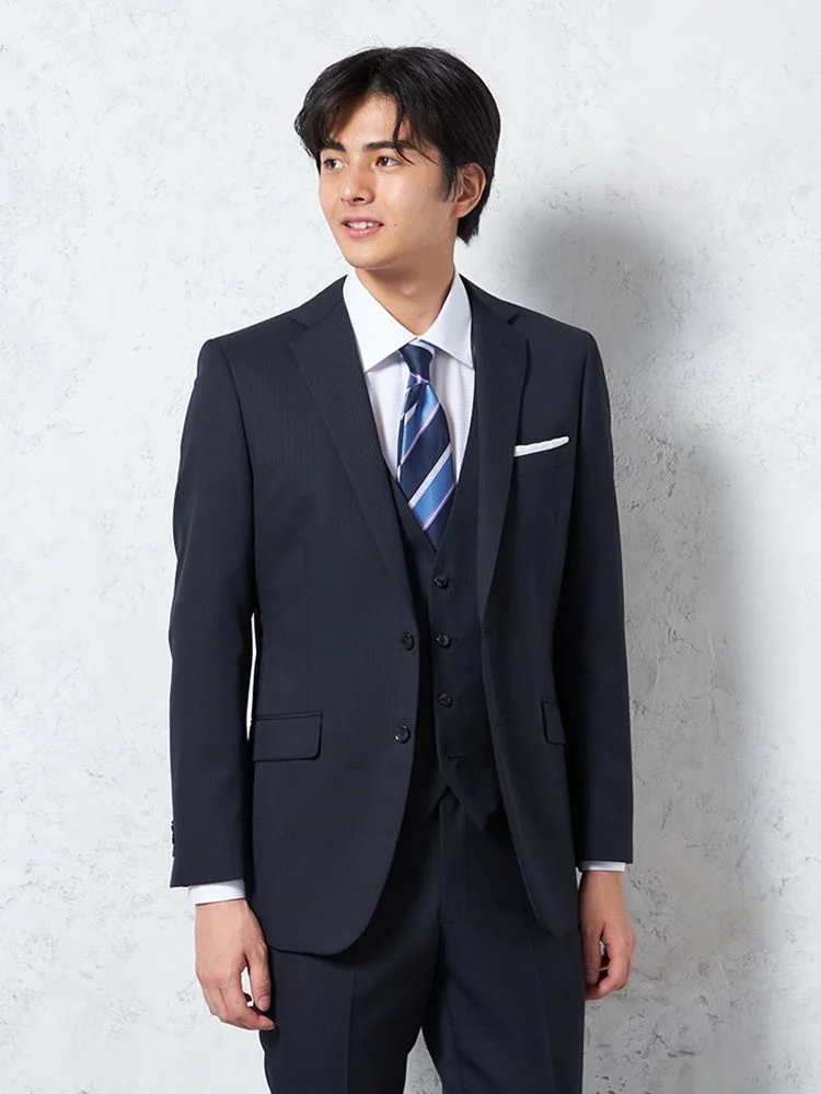 スマートにフォーマルな表情を演出できるベストつきスーツ。