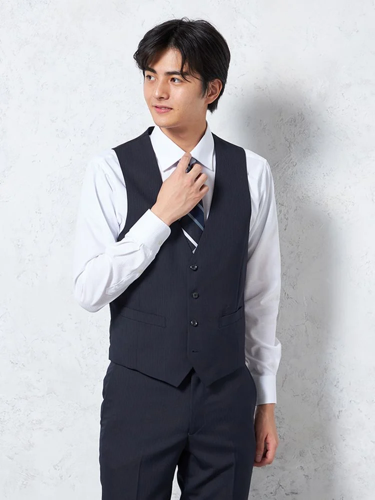 ジャケット、パンツ、ベストの3点セットで、スーツ全体を簡単にコーディネートできます。ビジネスやフォーマルな場面に最適です。