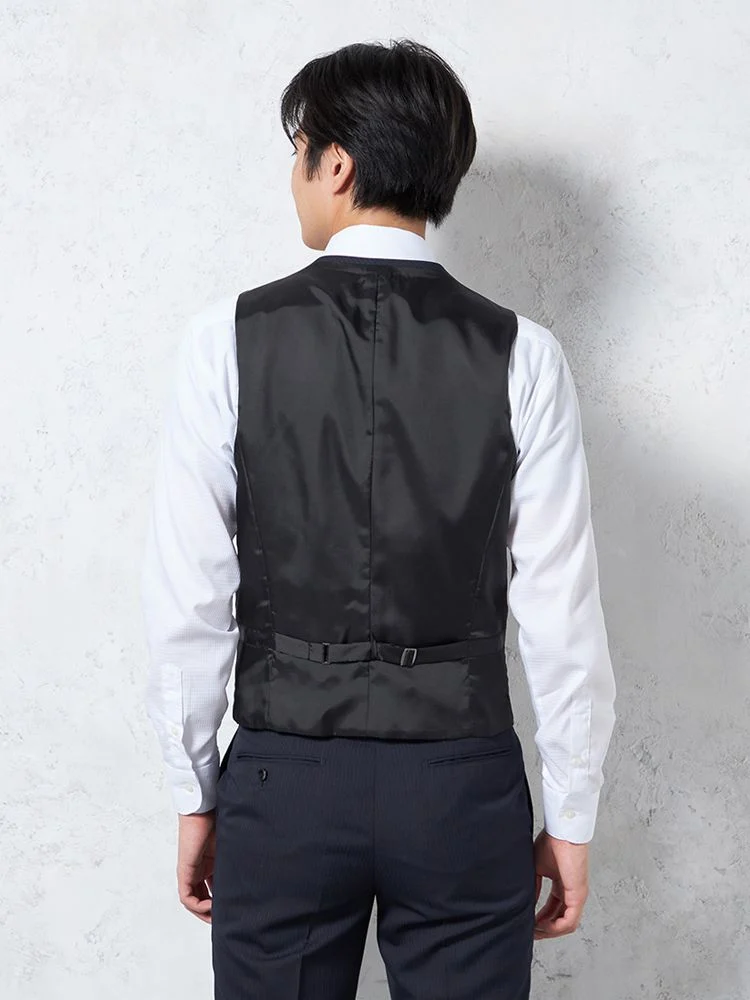 スマートにフォーマルな表情を演出できるベストつきスーツ。
