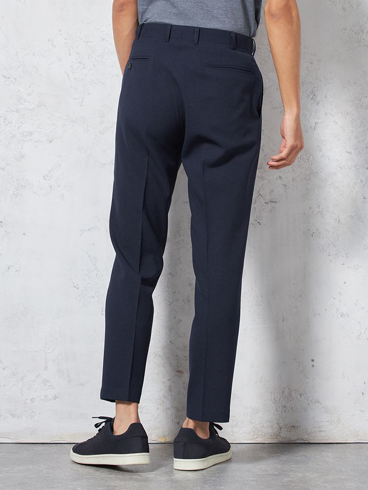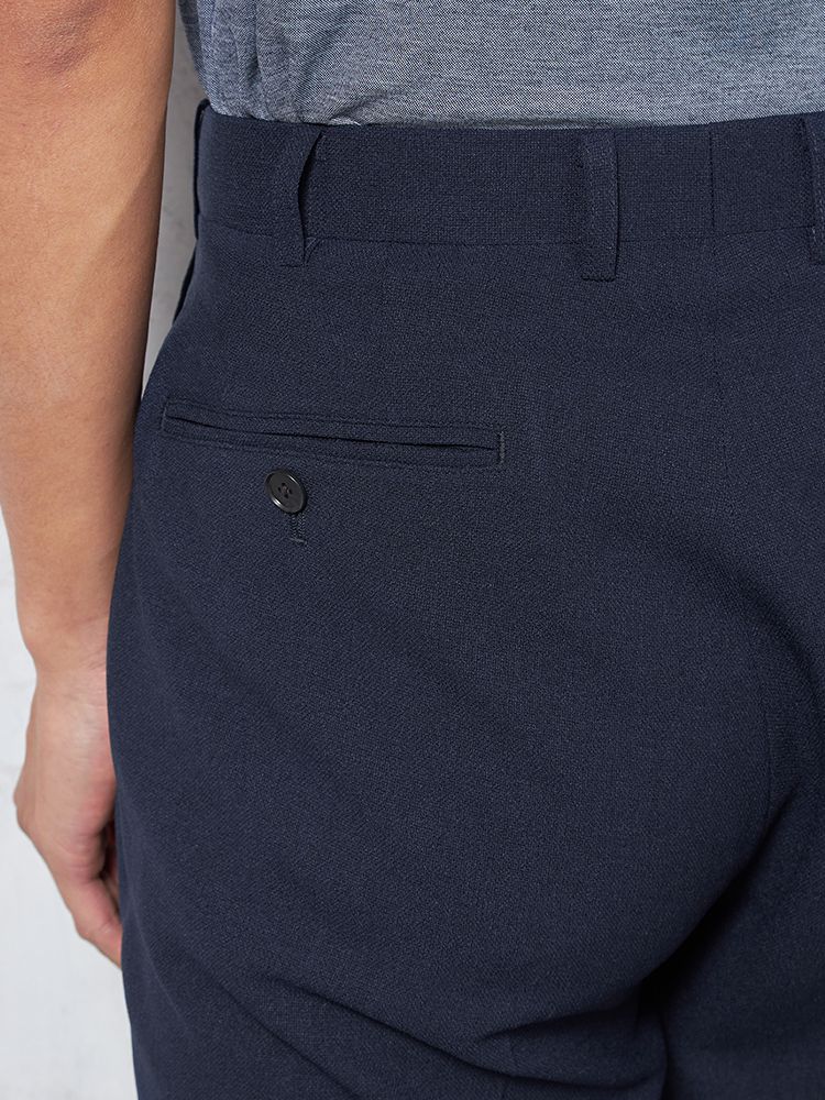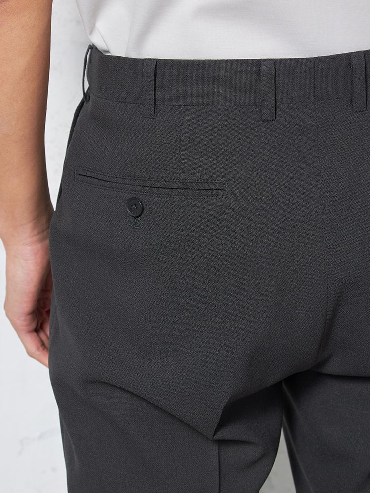 ノータックの腰回りと程よいテーパードのすっきりとしたシルエットに加え、ヒップポケットの位置にもこだわっており、後ろ姿も洗練された印象に。